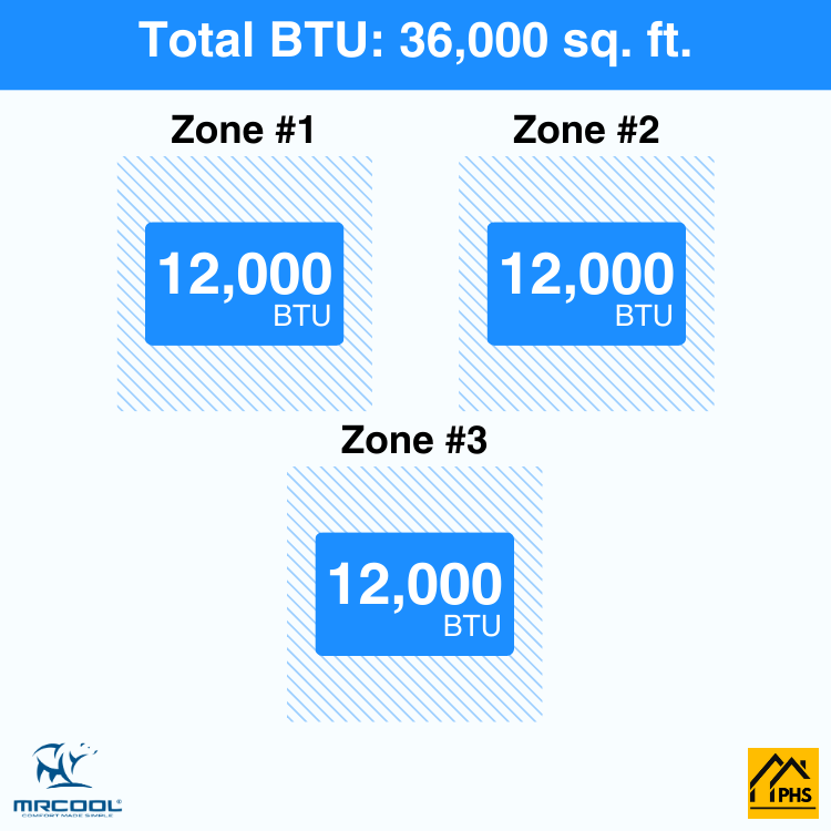 • Capacity: Total: 36,000 BTU//Zone 1: 12,000 BTU//Zone 2: 12,000 BTU//Zone 3: 12,000 BTU