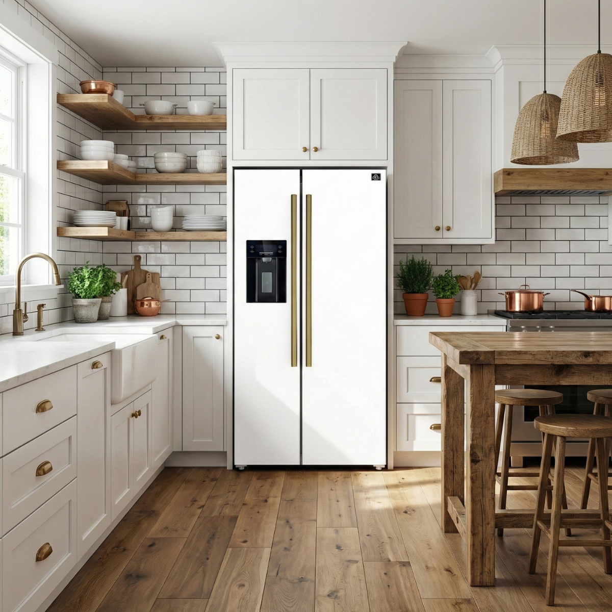 The Forno Salerno 36-inch side-by-side refrigerator combines optimal performance with maximized storage efficiency. With its frost-free multi air flow cooling system, this appliance maintains freshness in its 20 cu.ft. capacity interior. Adjustable shelving allows for versatile organization of groceries. Experience convenience with the water and ice dispenser, while antique brass handles add an elegant touch to the sleek design. This refrigerator is ENERGY STAR Certified for efficiency and features high-efficiency LED lighting to minimize food spoilage.