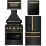 ZLINE Autograph Appliance Package - 30" Dual Fuel Range, Range Hood, 36" Refrigerator with Water/Ice Dispenser, 24" Microwave Drawer and Dishwasher in Black Stainless Steel with Polished Gold Accents