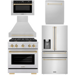 ZLINE Autograph Appliance Package - 30" Dual Fuel Range, Range Hood, 36" Refrigerator with Water/Ice Dispenser, 24" Microwave Drawer and Dishwasher in Stainless Steel with Polished Gold Accents
