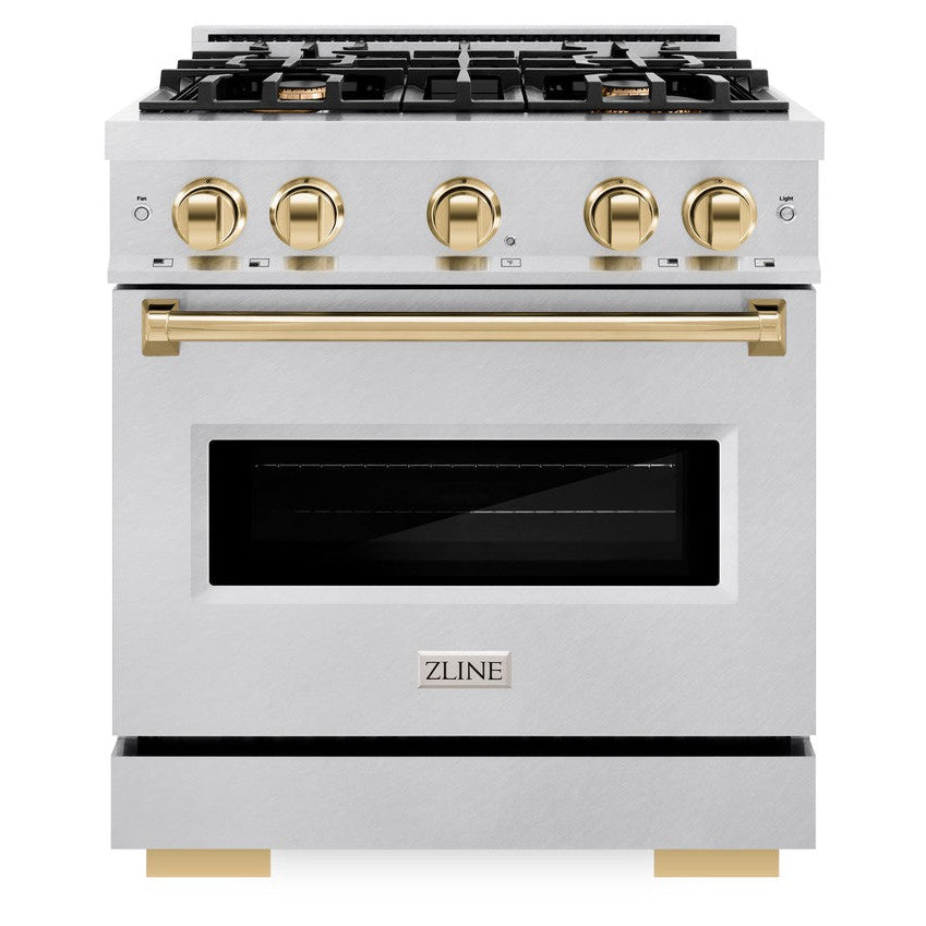 ZLINE Autograph 30" 4.2 cu. ft. Classic Dual Fuel Range with 4 Burner Gas Cooktop and Electric Convection Oven in Satin Stainless Steel with Polished Gold Accents, CDRSZ-30-G