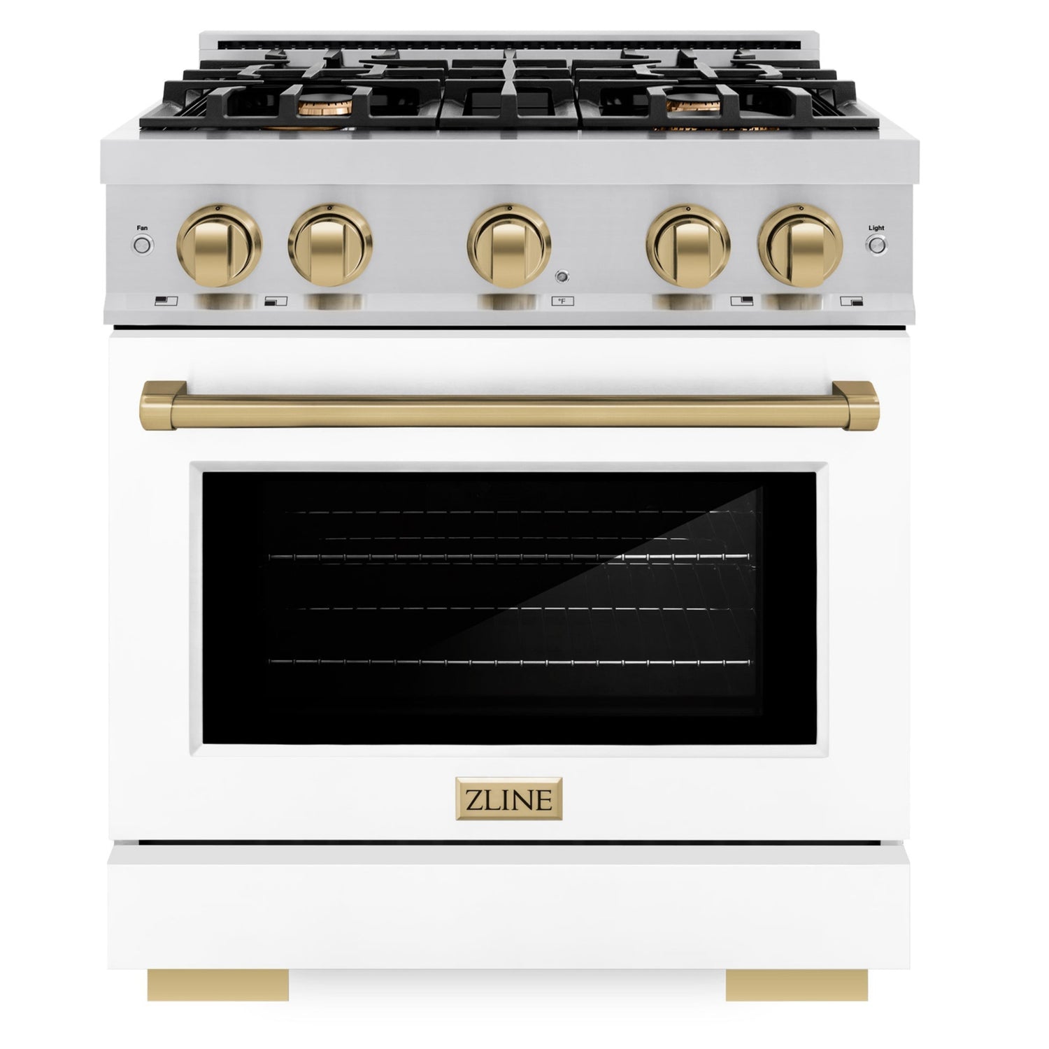 Luxury isn't meant to be desired - it's meant to be attainable. The ZLINE Autograph Edition 30 in. 4.2 cu. ft. Select Gas Range with 4 Burner Cooktop and Convection Gas Oven in Stainless Steel with White Matte Door and Champagne Bronze Accents (HGRZ-WM-30-CB) combines the elegance of a hand-finished porcelain gas cooktop with 4 Italian-made auto-reignition burners, a gas convection oven with an energy-efficient cooling fan to ensure quiet operation, a beautiful white matte door with a Horizon window design, and stunning champagne bronze knobs and handle allowing you to master every meal. With a modern, timeless style and refined functionality, ZLINE Select Gas Ranges are masterfully crafted to deliver an elevated culinary experience.