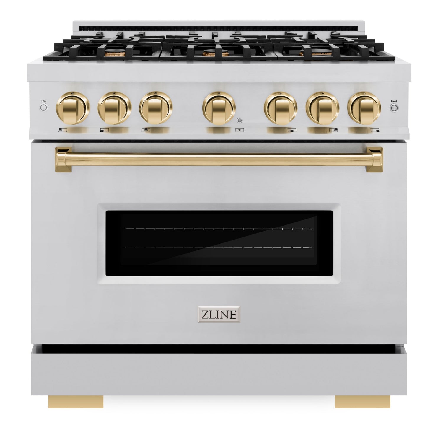 Luxury isn't meant to be desired - it's meant to be attainable. The ZLINE Autograph Edition 36 in. 5.2 cu. ft. Classic Dual Fuel Range with 6 Burner Gas Cooktop and Electric Convection Oven in Stainless Steel with Polished Gold Accents (CDRZ-36-G) combines the elegance of a hand-finished porcelain gas cooktop with 6 Italian-made auto-reignition burners, an electric convection oven with an energy-efficient cooling fan to ensure quiet operation, a Landscape oven door window design, and stunning polished gold knobs and handle allowing you to master every meal. With a modern, timeless style and refined functionality, ZLINE Classic Dual Fuel Ranges are masterfully crafted to deliver an elevated culinary experience.