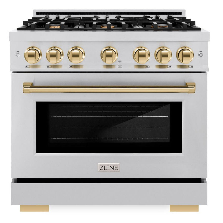 Luxury isn't meant to be desired - it's meant to be attainable. The ZLINE Autograph Edition 36 in. 5.2 cu. ft. Select Dual Fuel Range with 6 Burner Gas Cooktop and Electric Convection Oven in Stainless Steel with Polished Gold Accents (HDRZ-36-G) combines the elegance of a hand-finished porcelain gas cooktop with 6 Italian-made auto-reignition burners, an electric convection oven with an energy-efficient cooling fan to ensure quiet operation, a Horizon oven door window design, and stunning polished gold knobs and handle allowing you to master every meal. With a modern, timeless style and refined functionality, ZLINE Select Dual Fuel Ranges are masterfully crafted to deliver an elevated culinary experience.