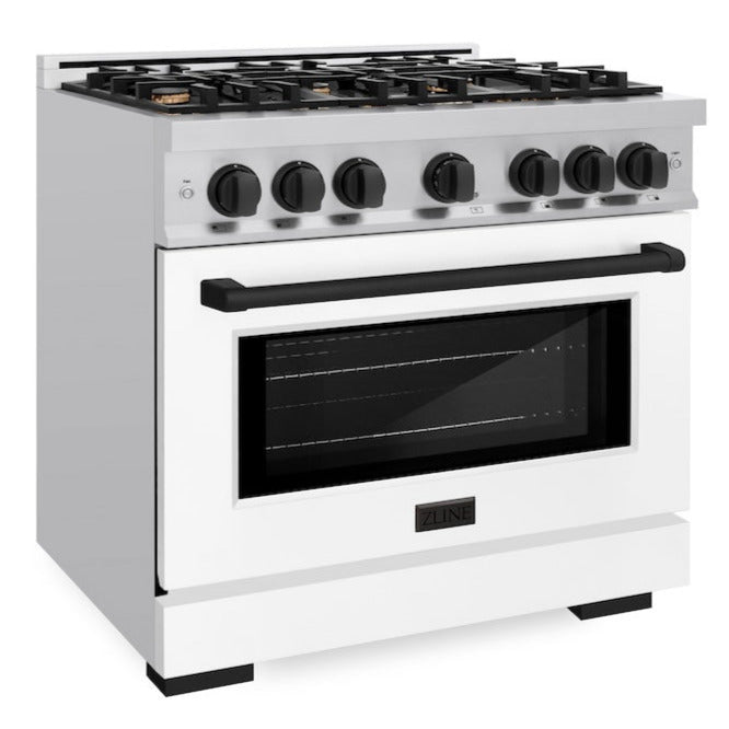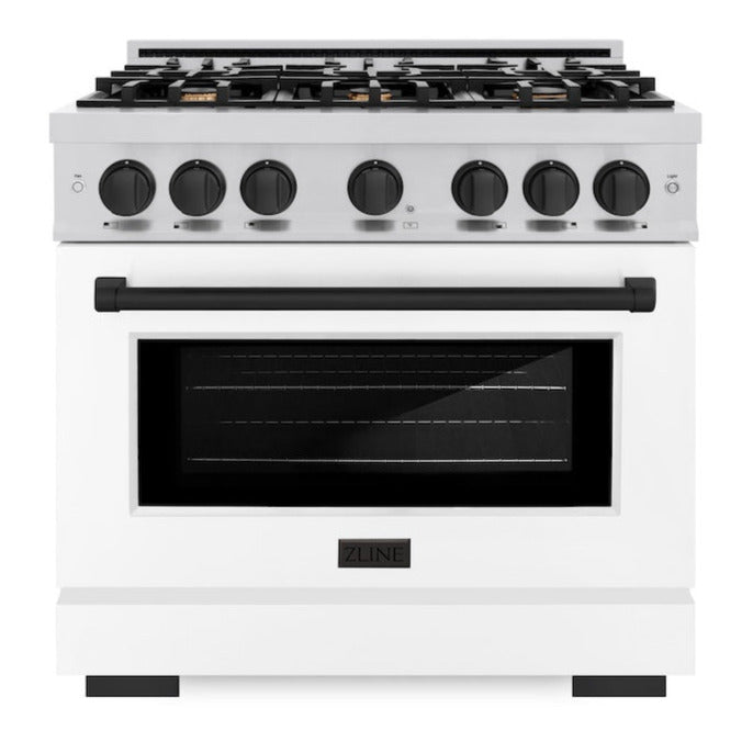 Luxury isn't meant to be desired - it's meant to be attainable. The ZLINE Autograph Edition 36 in. 5.2 cu. ft. Select Dual Fuel Range with 6 Burner Gas Cooktop and Electric Convection Oven in Stainless Steel with White Matte Door and Matte Black Accents (HDRZ-WM-36-MB) combines the elegance of a hand-finished porcelain gas cooktop with 6 Italian-made auto-reignition burners, an electric convection oven with an energy-efficient cooling fan to ensure quiet operation, a beautiful white matte door with a Horizon window design, and stunning matte black knobs and handle allowing you to master every meal. With a modern, timeless style and refined functionality, ZLINE Select Dual Fuel Ranges are masterfully crafted to deliver an elevated culinary experience.