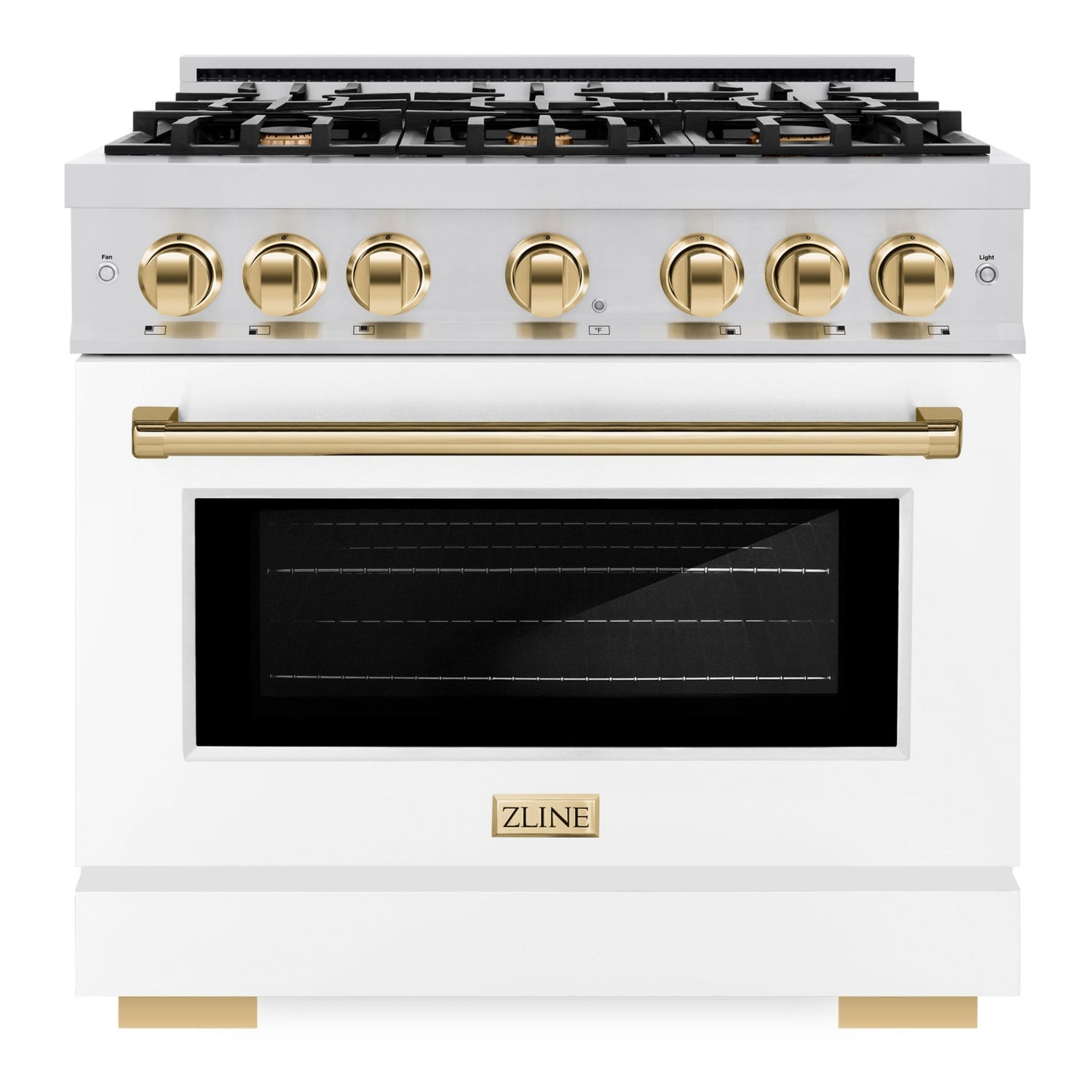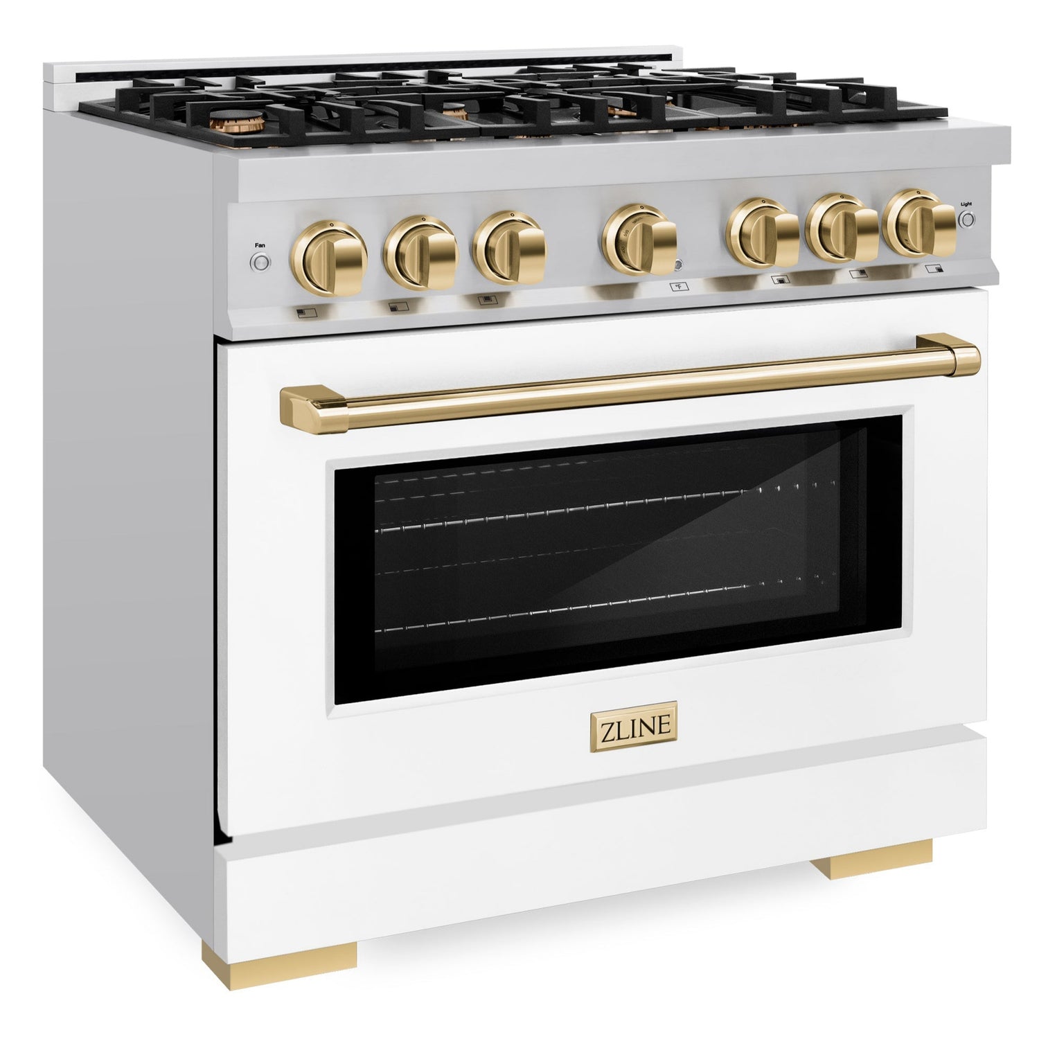 Luxury isn't meant to be desired - it's meant to be attainable. The ZLINE Autograph Edition 36 in. 5.2 cu. ft. Select Dual Fuel Range with 6 Burner Gas Cooktop and Electric Convection Oven in Stainless Steel with White Matte Door and Polished Gold Accents (HDRZ-WM-36-G) combines the elegance of a hand-finished porcelain gas cooktop with 6 Italian-made auto-reignition burners, an electric convection oven with an energy-efficient cooling fan to ensure quiet operation, a beautiful white matte door with a Horizon window design, and stunning polished gold knobs and handle allowing you to master every meal. With a modern, timeless style and refined functionality, ZLINE Select Dual Fuel Ranges are masterfully crafted to deliver an elevated culinary experience.