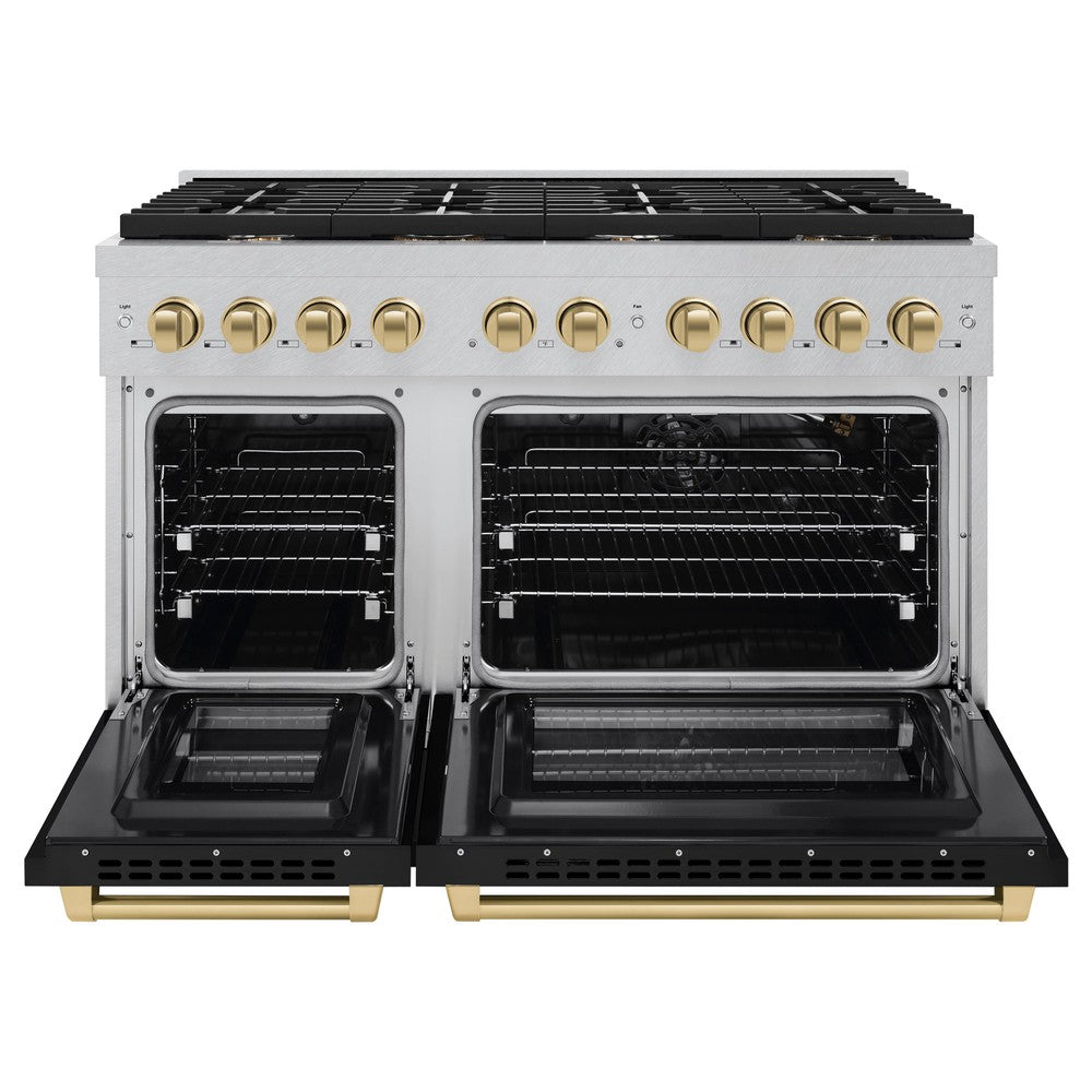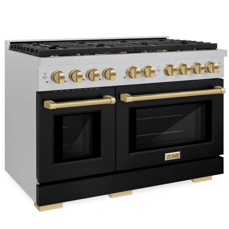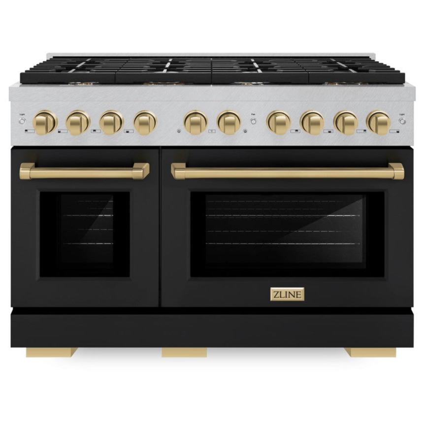 ZLINE Autograph 48" 6.7 cu. ft. Paramount Double Oven Dual Fuel Range with 8 Burner Gas Cooktop in Satin Stainless Steel with Black Matte Doors and Champagne Bronze Accents, SDRSZ-BLM-48-CB