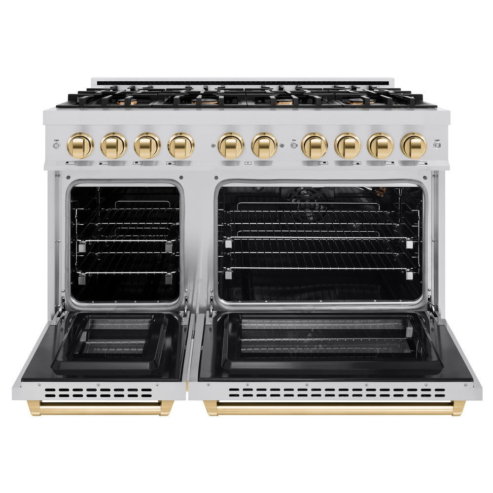 ZLINE Autograph 48" 6.7 cu. ft. Select Double Oven Gas Range with 8 Burners in Stainless Steel and Polished Gold Accents, HGRZ-48-G