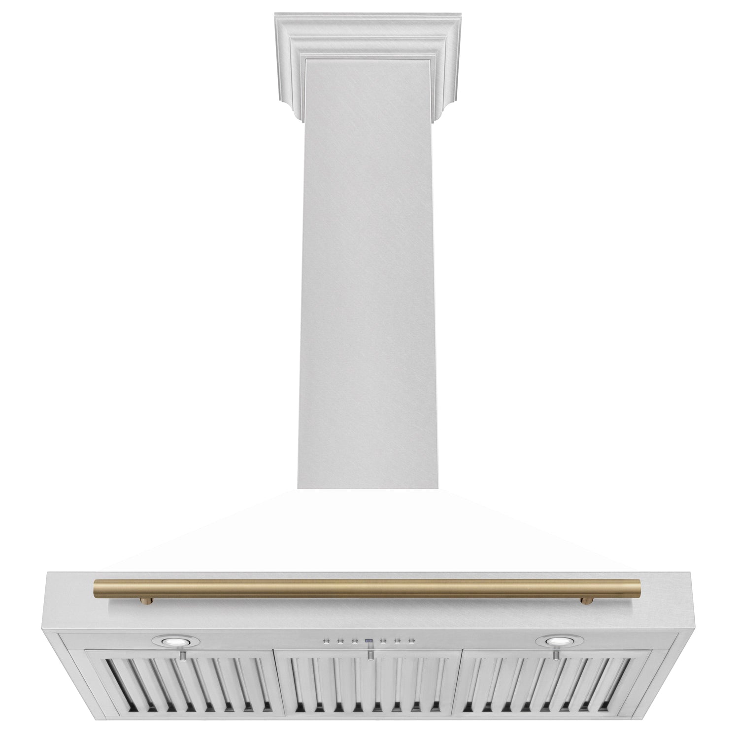 ZLINE Autograph 36" Convertible Satin Stainless Steel Wall Mount Range Hood with White Matte Shell and Champagne Bronze Handle, KB4SNZ-WM36-CB