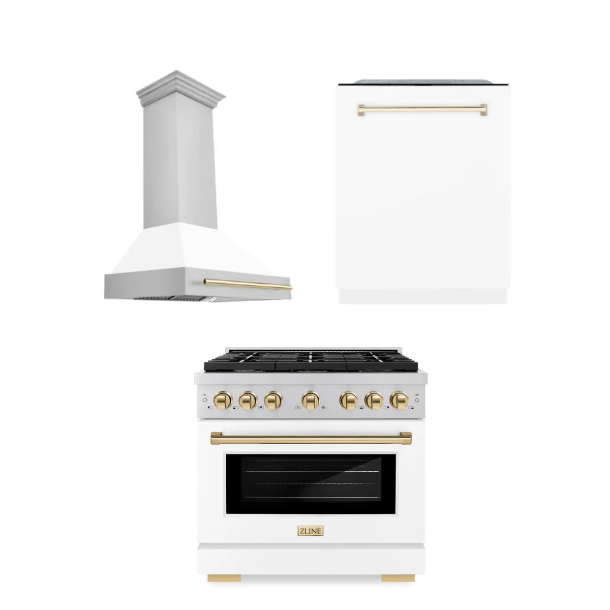 ZLINE Autograph Package - 36 In. Gas Range, Range Hood, Dishwasher in White with Gold Accents, 3AKP-RGWMRHDWM36-G