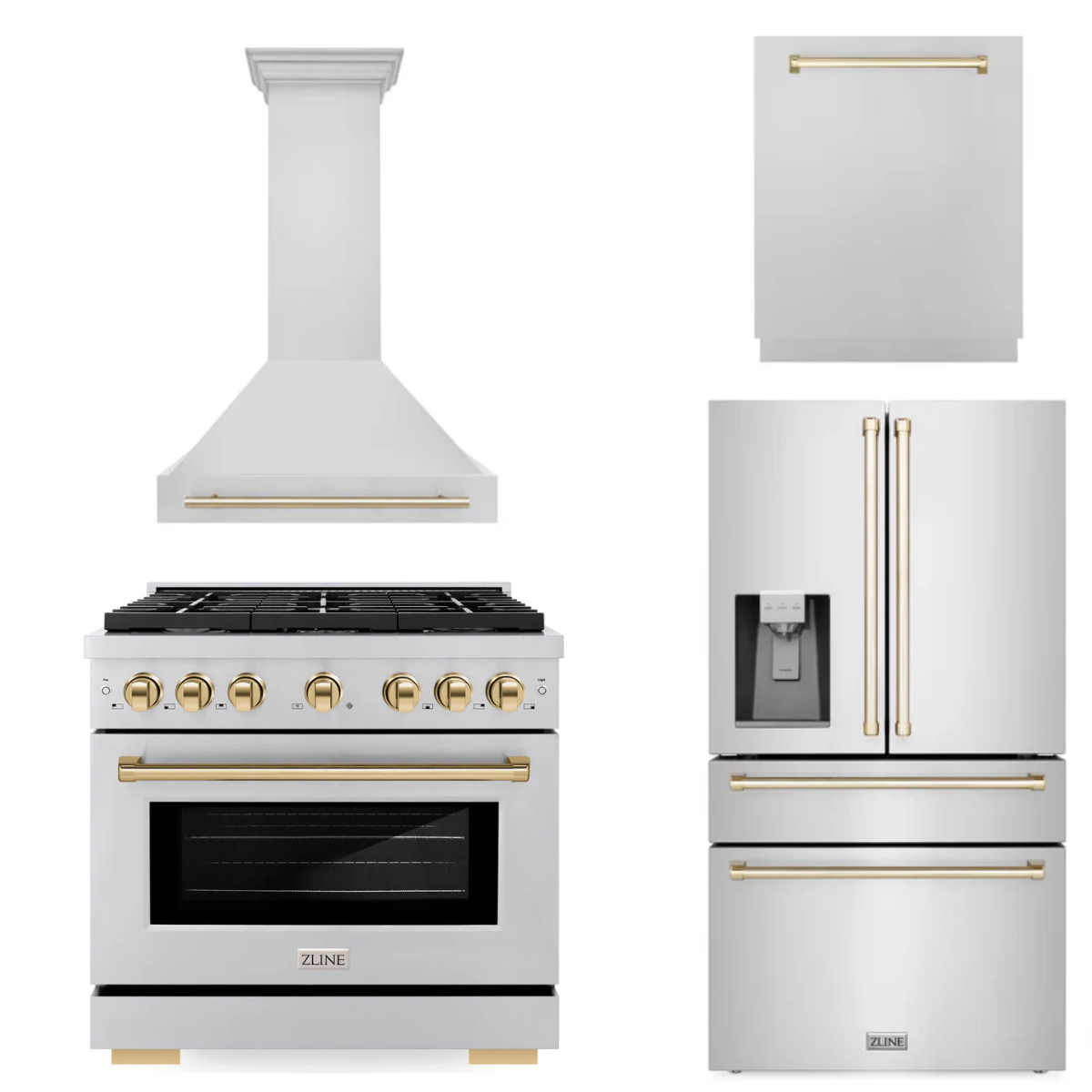 ZLINE Autograph Package - 36" Gas Range, Range Hood, Refrigerator with Water & Ice Dispenser, Dishwasher with Gold Accents