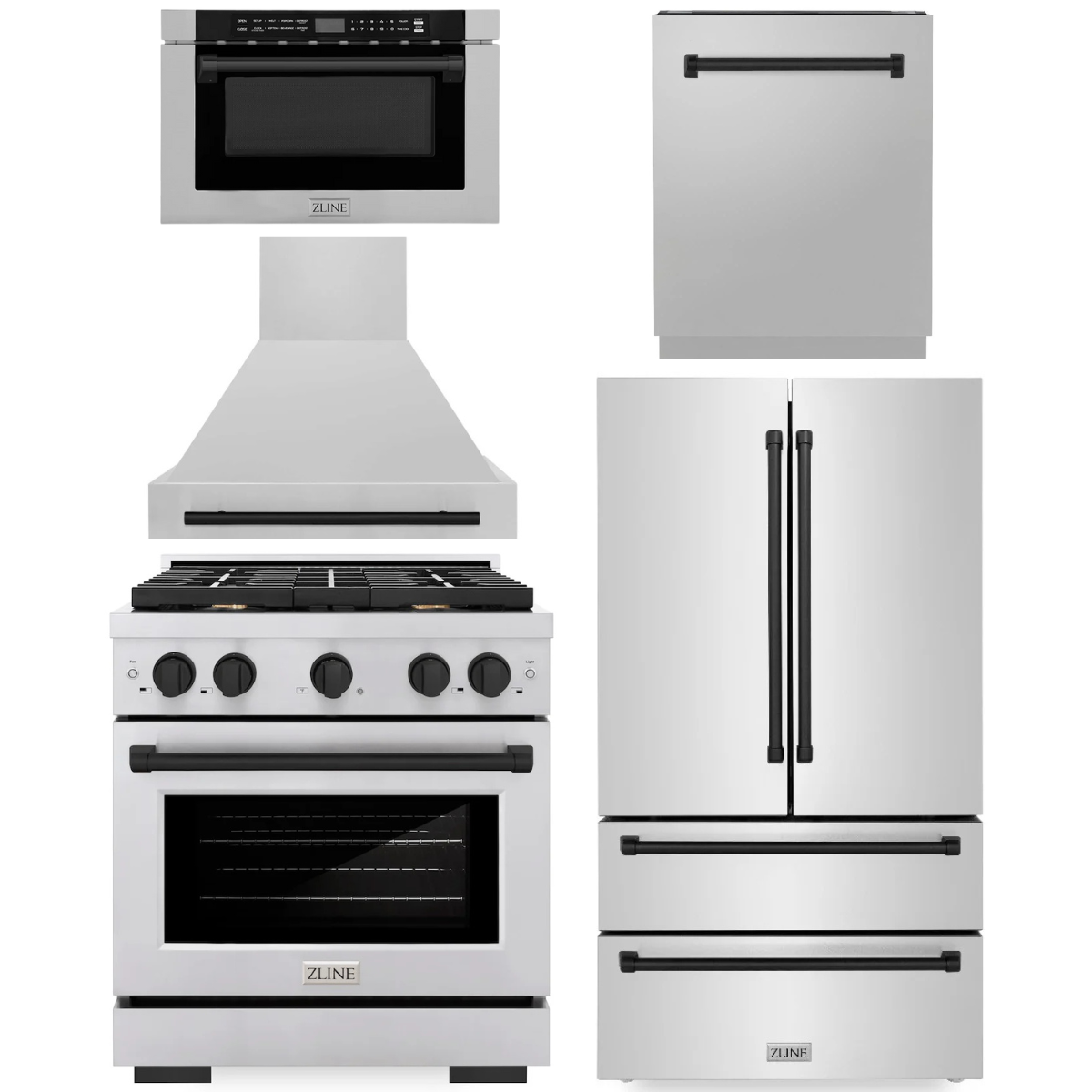 ZLINE Autograph Appliance Package - 30" Dual Fuel Range, Range Hood, 36" Refrigerator with Ice Maker, 24" Microwave Drawer and Dishwasher in Stainless Steel with Matte Black Accents