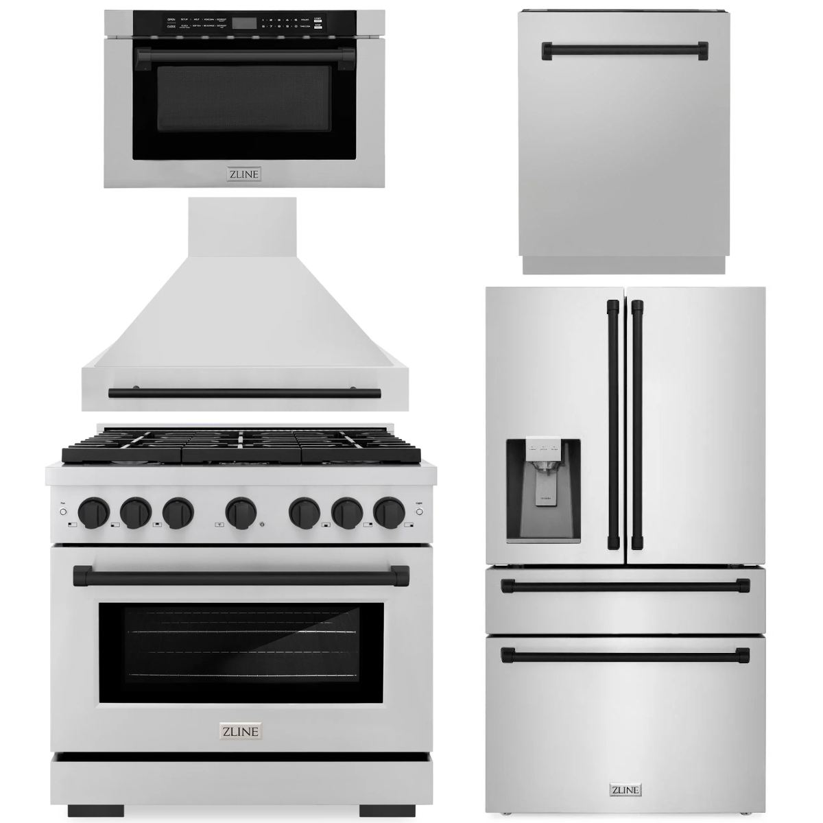 ZLINE Autograph Appliance Package - 36" Dual Fuel Range, Range Hood, 36" Refrigerator with Water/Ice Dispenser, 24" Microwave Drawer and Dishwasher in Stainless Steel with Matte Black Accents