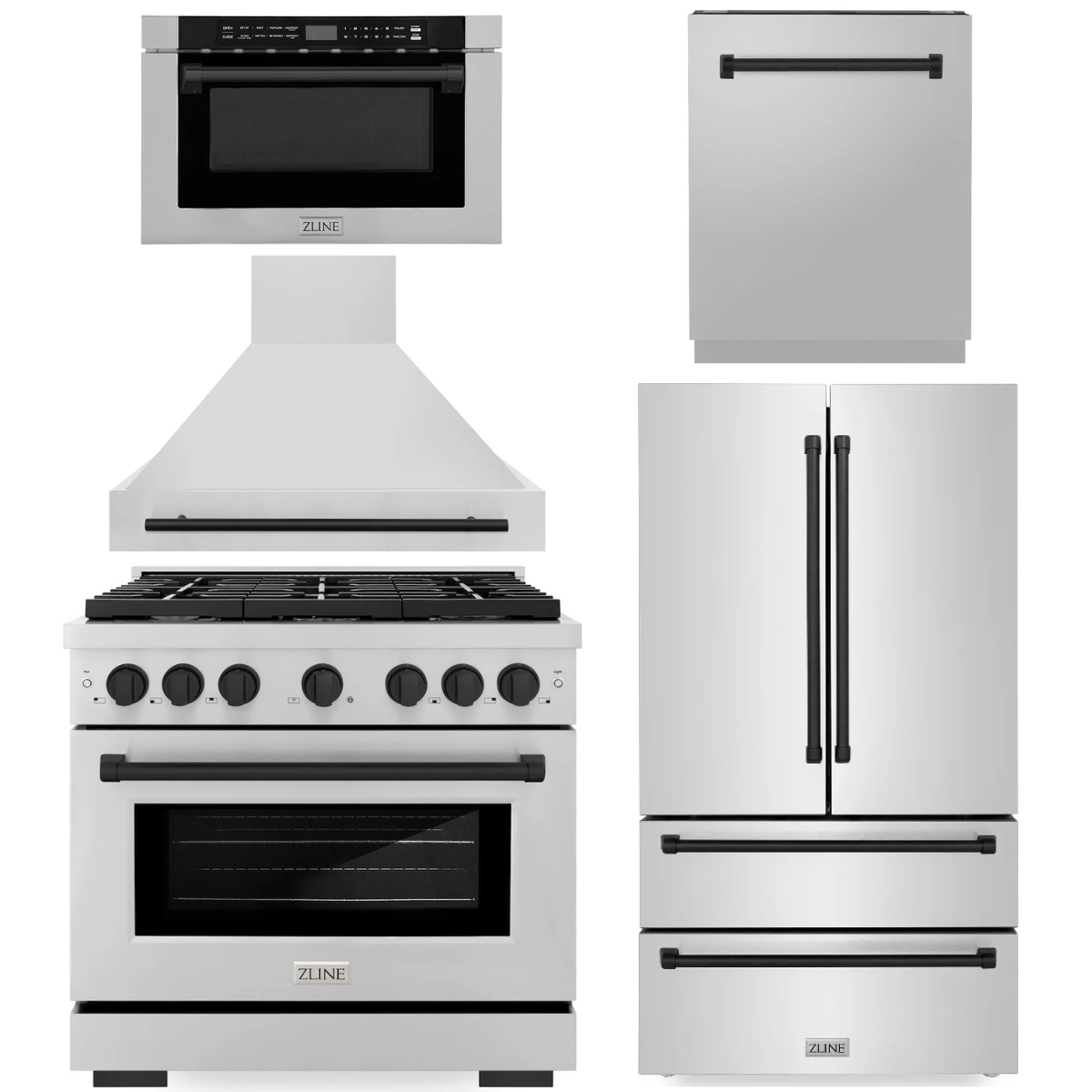 ZLINE Autograph Appliance Package - 36" Gas Range, Range Hood, 36" Refrigerator with Ice Maker, 24" Microwave Drawer and Dishwasher in Stainless Steel with Matte Black Accents