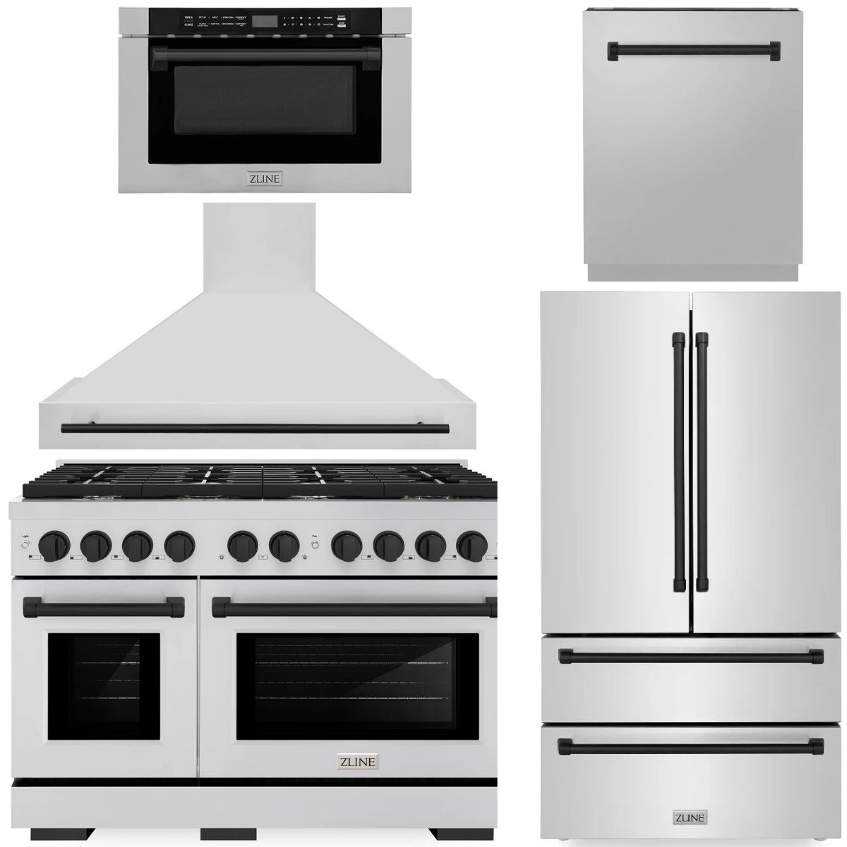 ZLINE Autograph Appliance Package - 48" Dual Fuel Range, Range Hood, 36" Refrigerator with Ice Maker, 24" Microwave Drawer and Dishwasher in Stainless Steel with Matte Black Accents