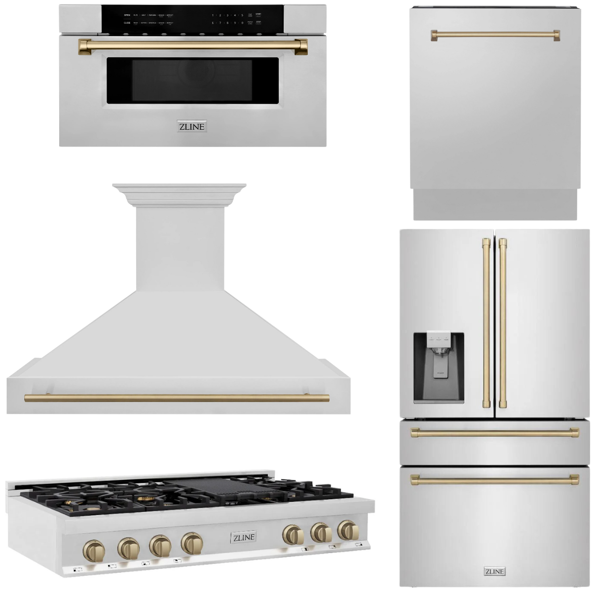 ZLINE Autograph Bronze Package - 48" Rangetop, 48" Range Hood, Dishwasher, Refrigerator with External Water and Ice Dispenser, Microwave Drawer