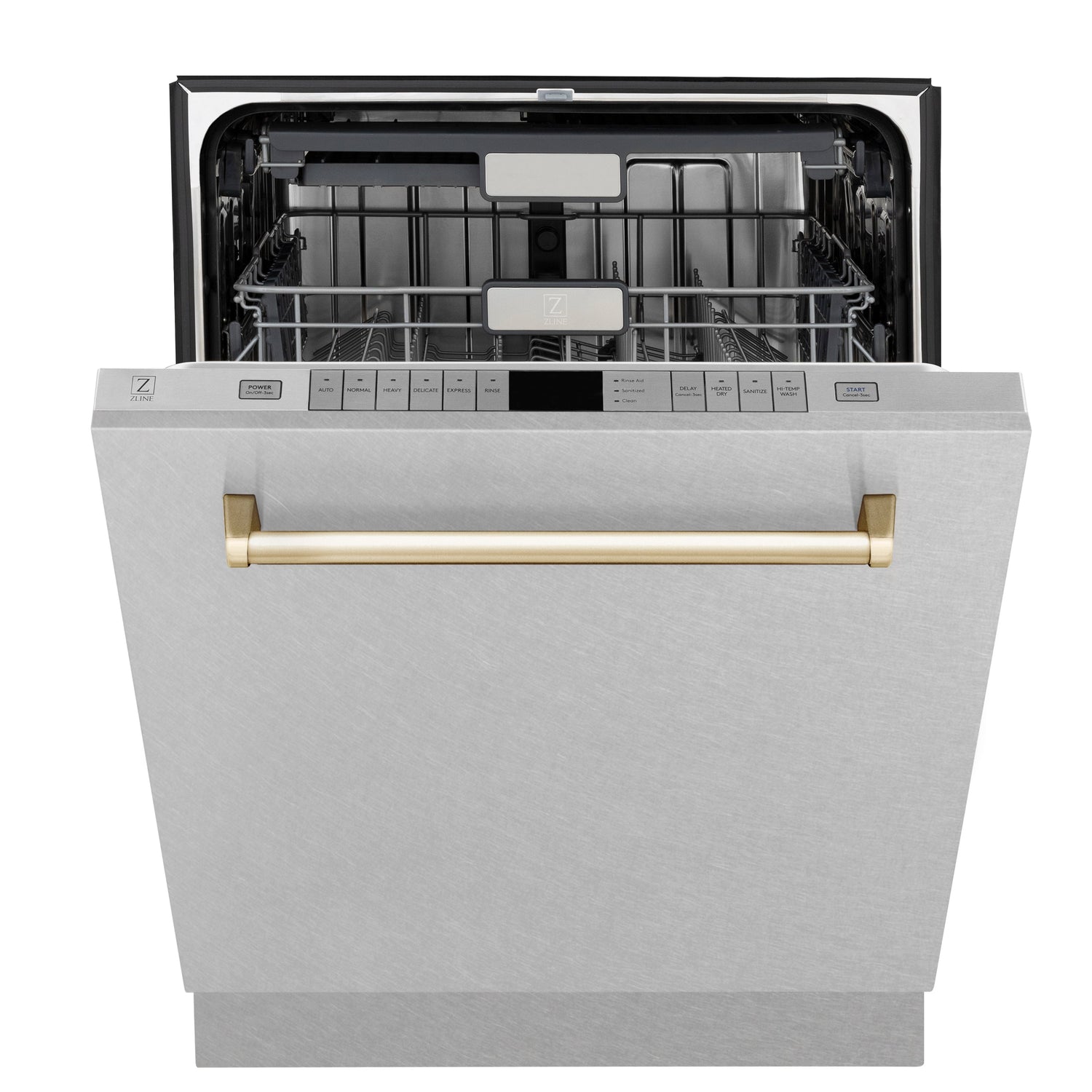 ZLINE Autograph 24" Monument Series 3rd Rack Top Touch Control Tall Tub Dishwasher with Satin Stainless Steel Panel and Polished Gold Handle, 45dBa, DWMTZ-SN-24-G