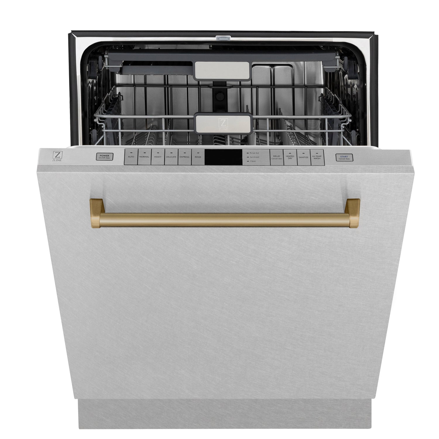 ZLINE Autograph 24" Monument Series 3rd Rack Top Touch Control Tall Tub Dishwasher with Satin Stainless Steel Panel and Champagne Bronze Handle, 45dBa, DWMTZ-SN-24-CB