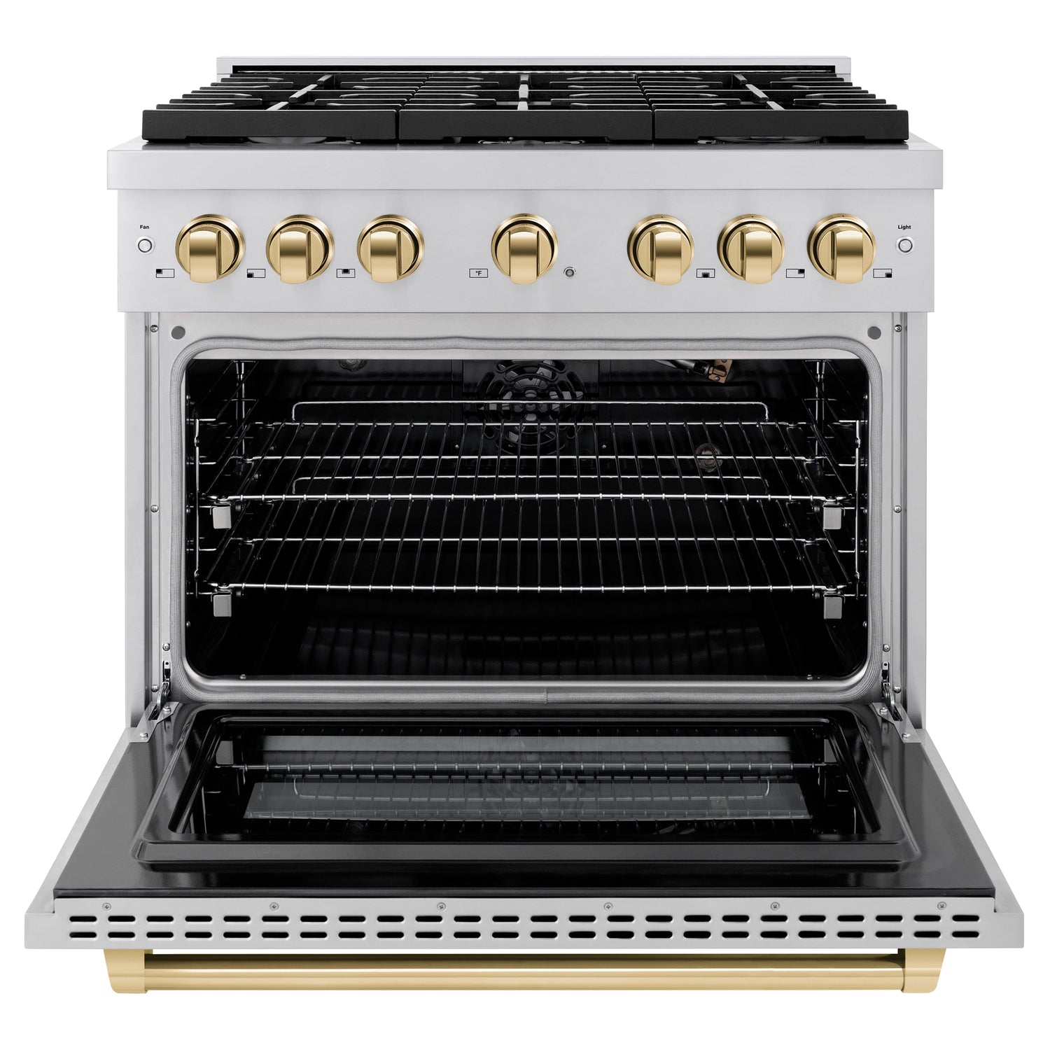 ZLINE Autograph 36" 5.2 cu. ft. Paramount Gas Range with Convection Gas Oven in Stainless Steel and Gold Accents, SGRZ-36-G