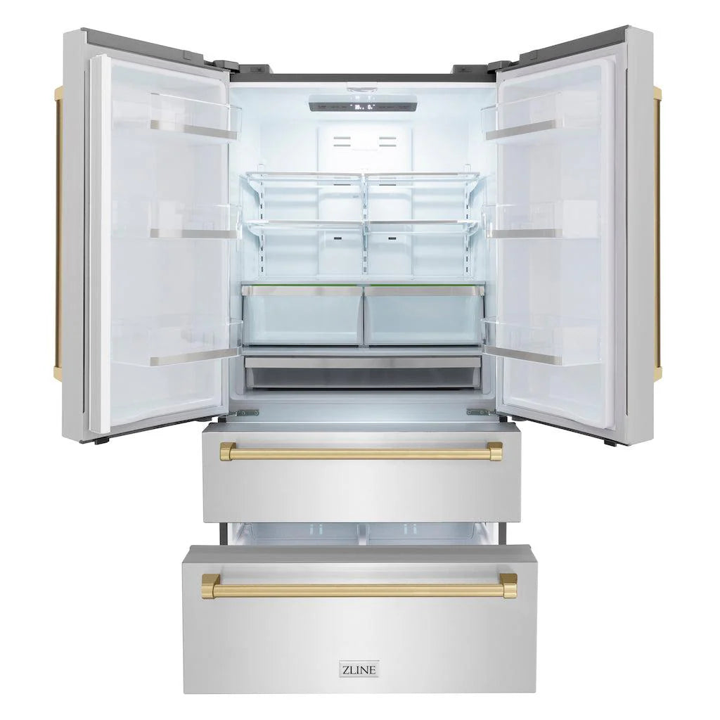 This ZLINE Autograph 36" 22.5 cu. ft Freestanding French Door Refrigerator, crafted in Lake Tahoe, USA, combines top-tier performance with classic design. This refrigerator is packed with innovative features to enhance your kitchen experience, making it the perfect blend of style and functionality.