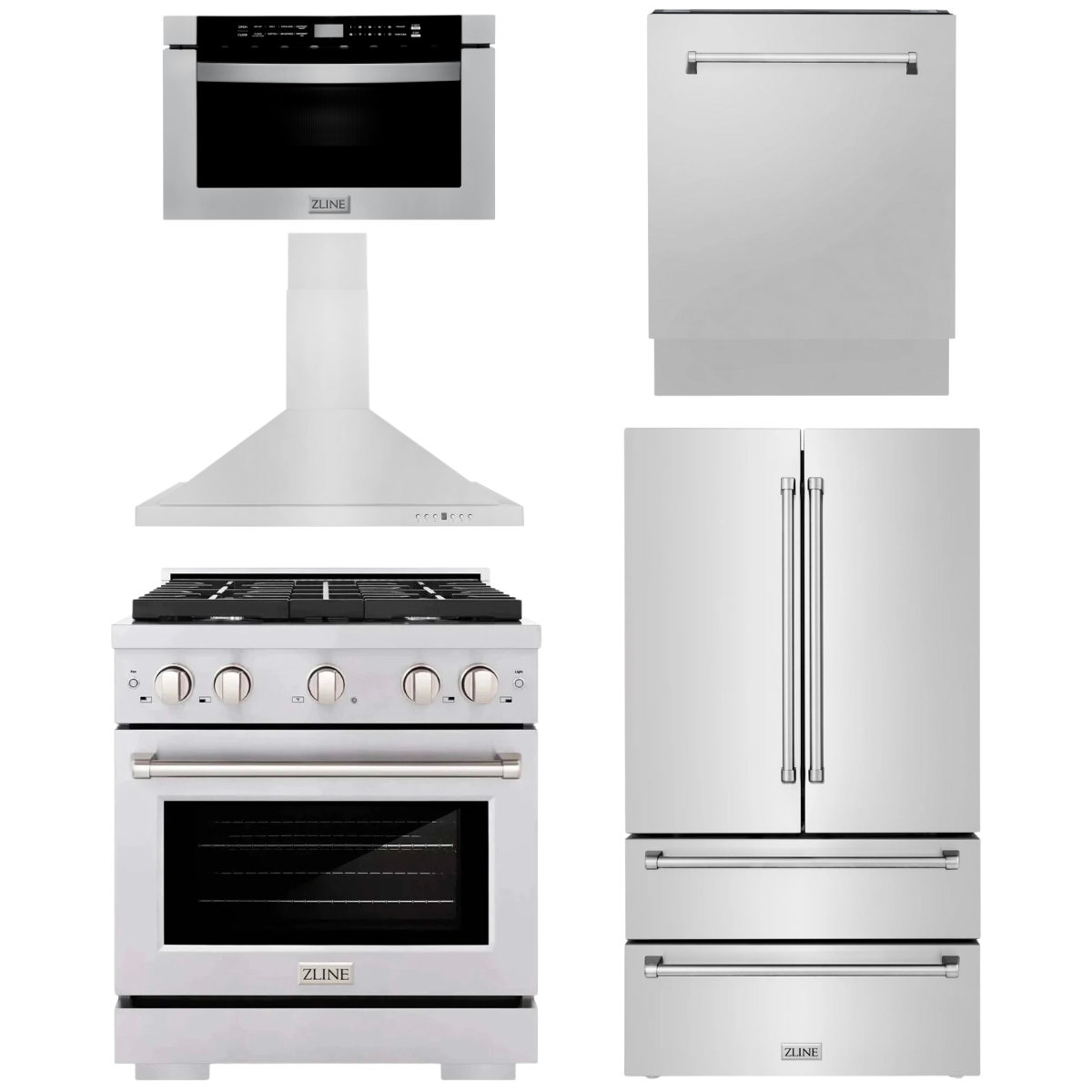 ZLINE Appliance Package - 30" Gas Range, Range Hood, 36" Refrigerator with Ice Maker, 24" Microwave Drawer and Dishwasher in Stainless Steel
