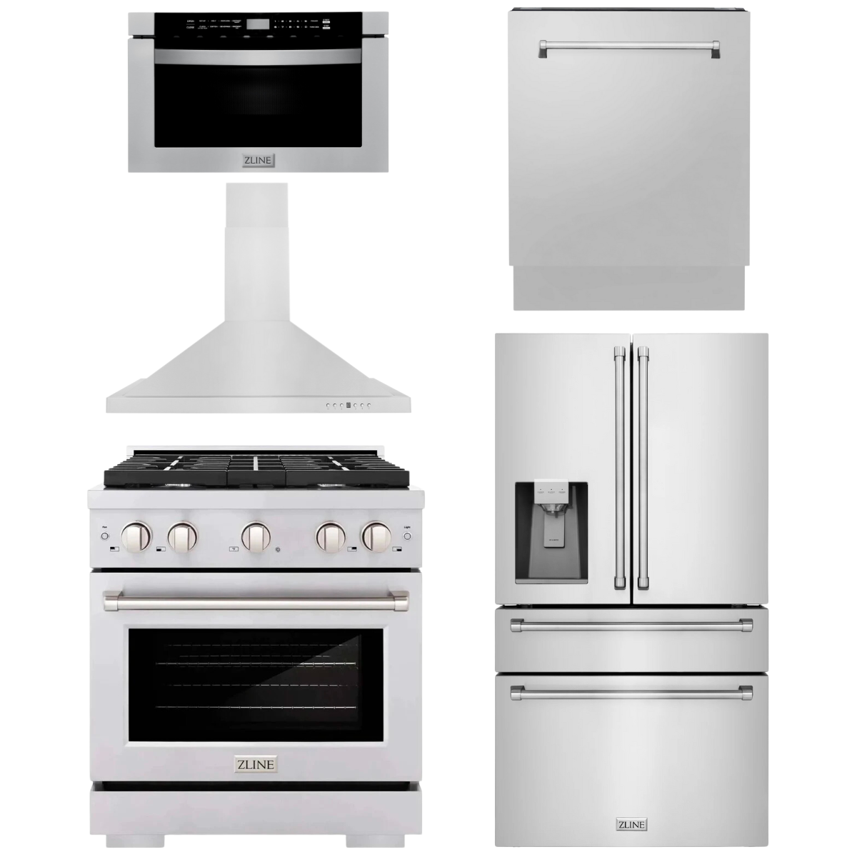 ZLINE Appliance Package - 30" Gas Range, Range Hood, 36" Refrigerator with Water/Ice Dispenser, 24" Microwave Drawer and Dishwasher in Stainless Steel
