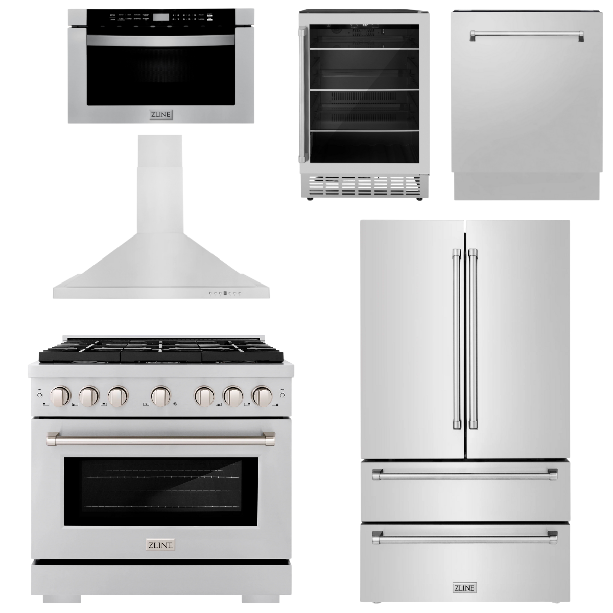 ZLINE Appliance Package - 36" Gas Range, Range Hood, Refrigerator, Microwave Drawer, Dishwasher and Beverage Fridge, 6KPR-SGRRH36-MWDWV-RBV