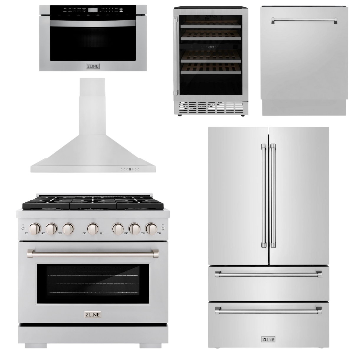 ZLINE Appliance Package - 36" Gas Range, Range Hood, Refrigerator, Microwave Drawer, Dishwasher and Wine Cooler, 6KPR-SGRRH36-MWDWV-RWV