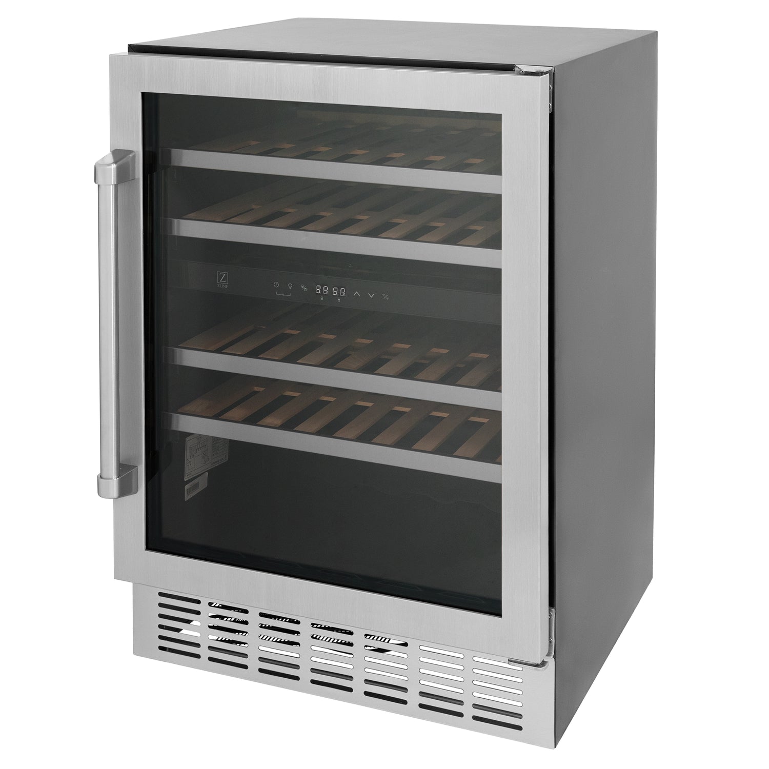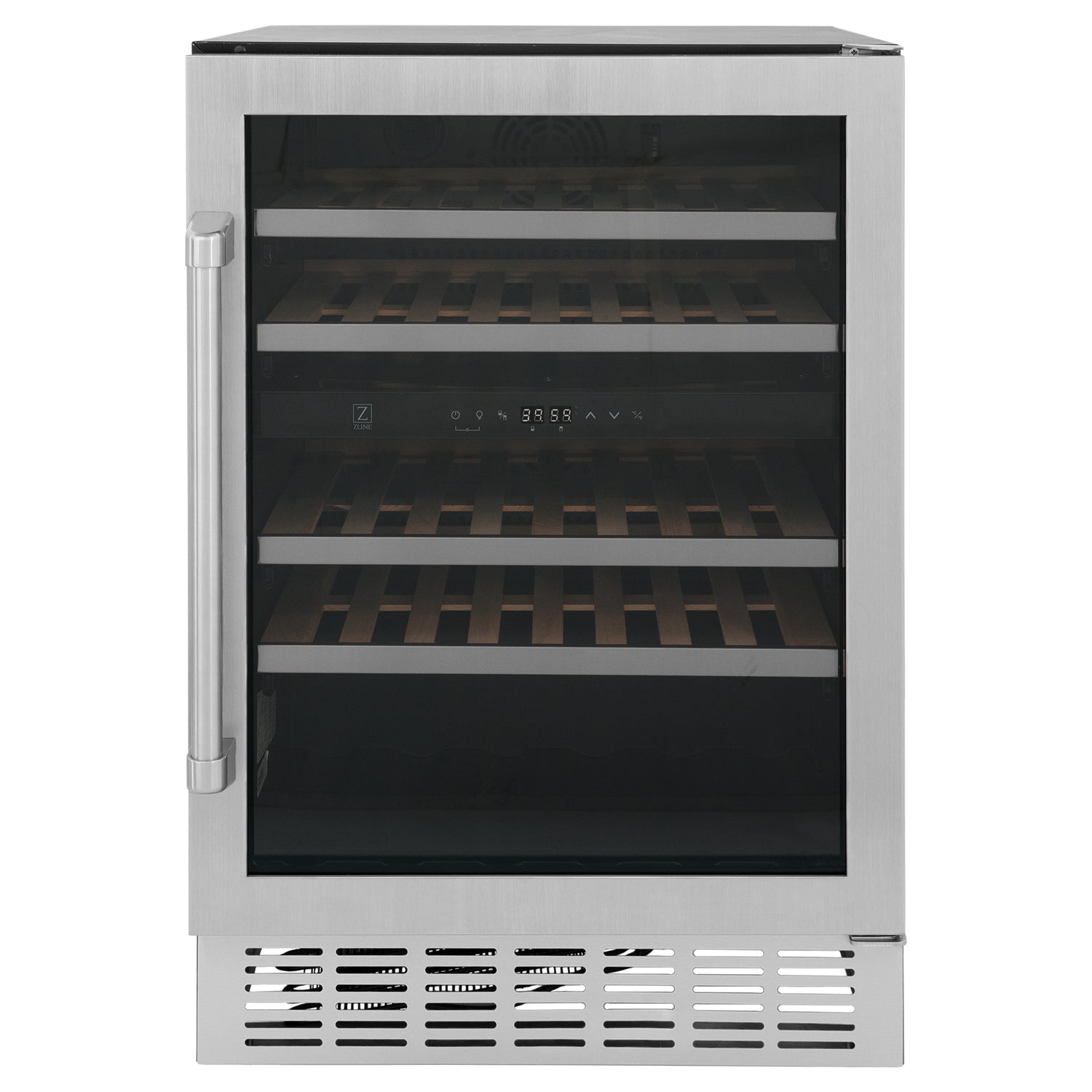 The ZLINE ZLINE 24" Dual Zone 44-Bottle Wine Cooler in Stainless Steel with Wood Shelf (RWV-UD-24) provides a premium entertainment experience by pairing unmatched cooling technology with luxurious style. Achieve ZLINE Attainable Luxury® excellence with innovative technology designed to enhance your kitchens capability.