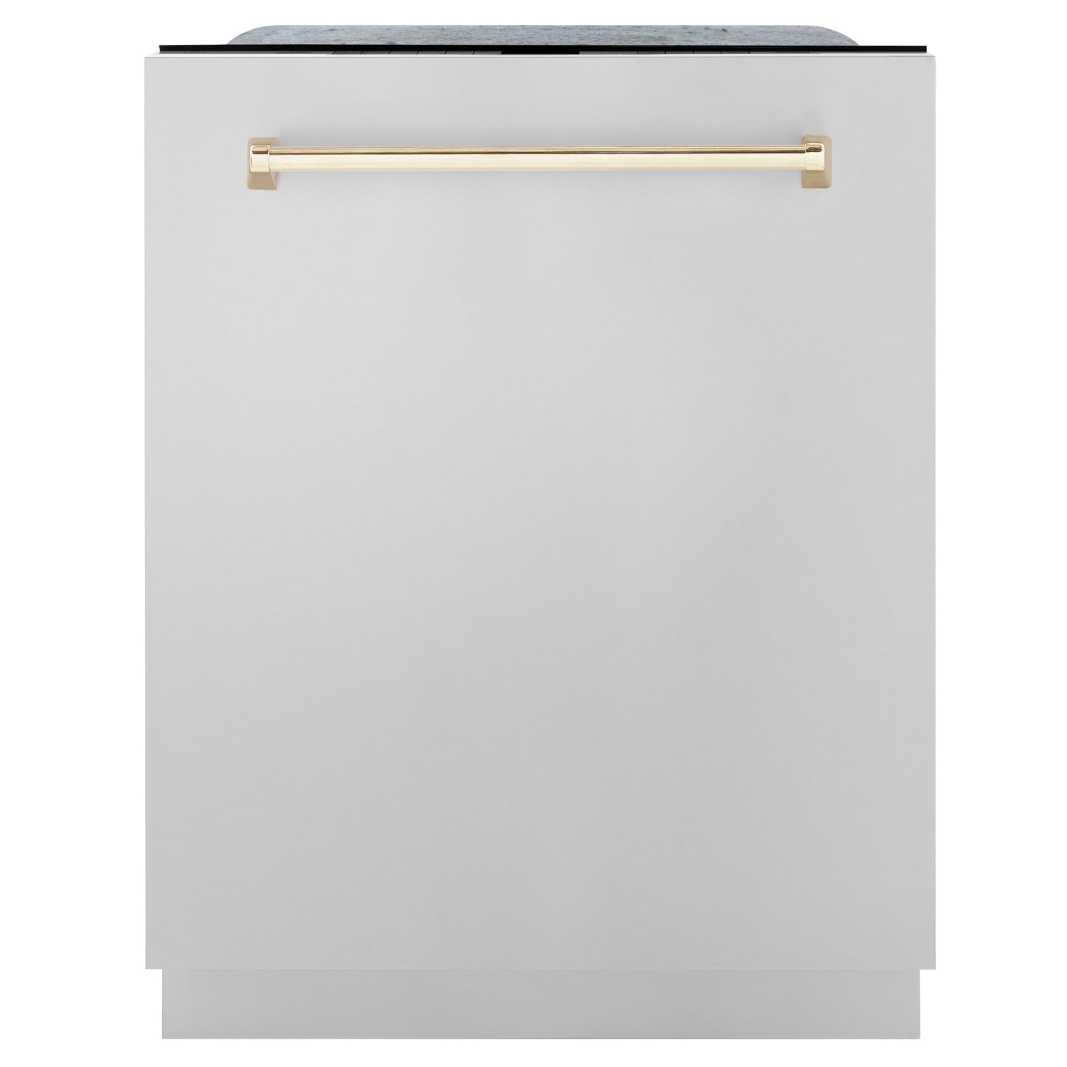 Introducing the ZLINE Autograph Edition 24" Dishwasher in Stainless Steel with a Gold Handle. Experience Attainable Luxury with this sophisticated professional dishwasher offering 6 wash cycles, 3 racks, 14 place settings and a stunning Gold Handle. DuraWash technology provides a powerful multi-motion clean, while the digital touch control panel makes operation a breeze. Two adjustable racks and a third utensil rack offer added flexibility, and ENERGYSTAR certification ensures an environment-friendly, optimized performance. Get unbeatable quality that's high-performing and customizable, and enjoy next day shipping when in stock. Discover the ultimate dishwashing experience with the Autograph Edition DWMTZ-304-24-G!