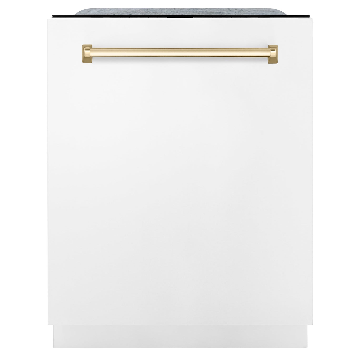 Discover stunning Attainable Luxury with the ZLINE Autograph Edition White Matte 24" Dishwasher (DWMTZ-WM-24-G)! Sporting a Gold Handle, 3 racks and 14 place settings, this dishwasher is designed to make cleaning your dishes easy and effortless. Being ENERGYSTAR Certified, this dishwasher utilizes multiple filter technology to ensure a powerful performance while being environmentally friendly. Featuring 6 wash cycles and DuraWash technology - a multi-motion system which spins clockwise and vertically throughout the cycle- this dishwasher is sure to deliver maximum performance. With two adjustable racks and a third utensil rack for added flexibility, you can customize this dishwasher to your needs. Experience the professional power and functionality of the Autograph Edition, inspired by the elegance of our home in Lake Tahoe, and enjoy a new meaning of dishwasher elegance! Ships next business day when in stock.