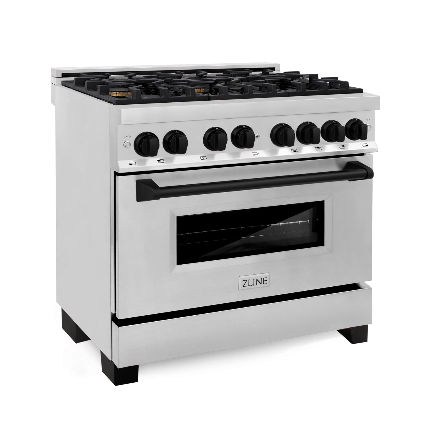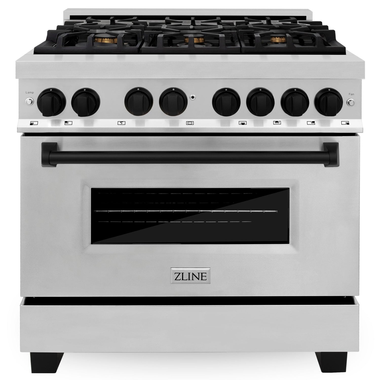 ZLINE Autograph Package - 36" Dual Fuel Range, Range Hood, Dishwasher, Refrigerator with Matte Black Accents