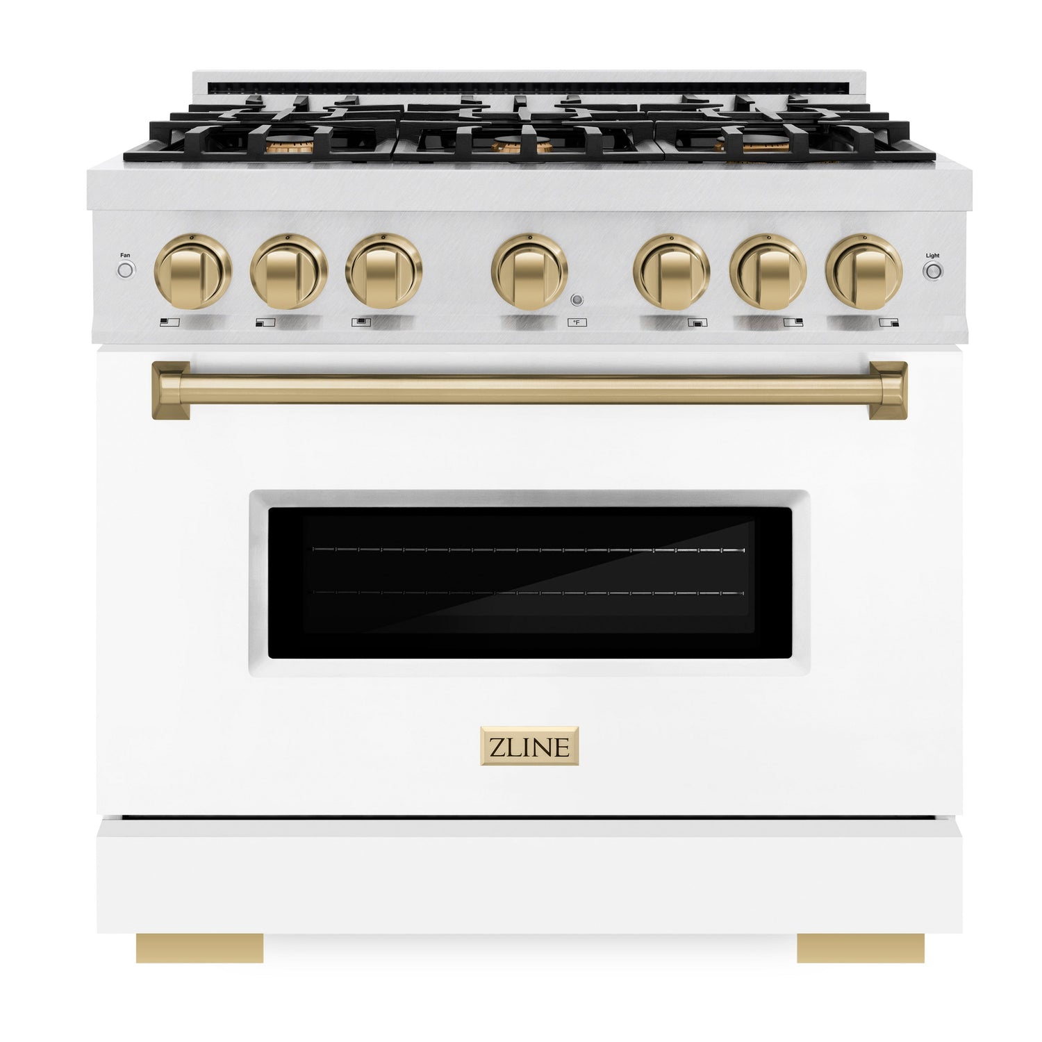 ZLINE Autograph 36" 5.2 cu. ft. Classic Dual Fuel Range with 6 Burner Gas Cooktop and Electric Convection Oven in Satin Stainless Steel with White Matte Door and Polished Gold Accents, CDRSZ-WM-36-G