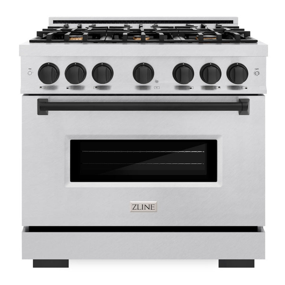 ZLINE Autograph 36" 5.2 cu. ft. Classic Gas Range with 6 Burner Cooktop and Convection Gas Oven in Satin Stainless Steel and Matte Black Accents, CGRSZ-36-MB