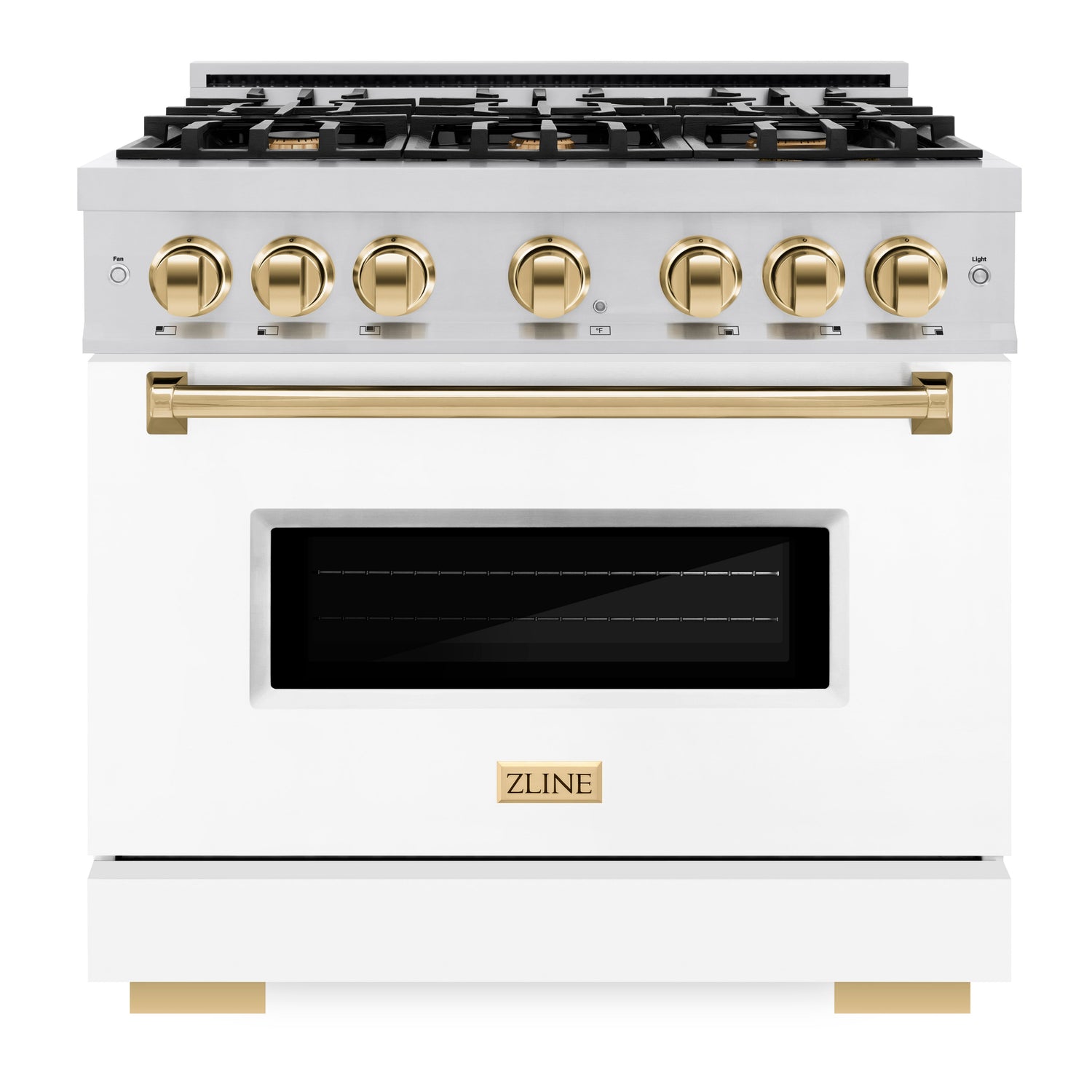 Luxury isn't meant to be desired - it's meant to be attainable. The ZLINE Autograph Edition 36 in. 5.2 cu. ft. Classic Gas Range with 6 Burner Cooktop and Convection Gas Oven in Stainless Steel with White Matte Door and Polished Gold Accents (CGRZ-WM-36-G) combines the elegance of a hand-finished porcelain gas cooktop with 6 Italian-made auto-reignition burners, a gas convection oven with an energy-efficient cooling fan to ensure quiet operation, a beautiful white matte door with a Landscape window design, and stunning polished gold knobs and handle allowing you to master every meal. With a modern, timeless style and refined functionality, ZLINE Classic Gas Ranges are masterfully crafted to deliver an elevated culinary experience.