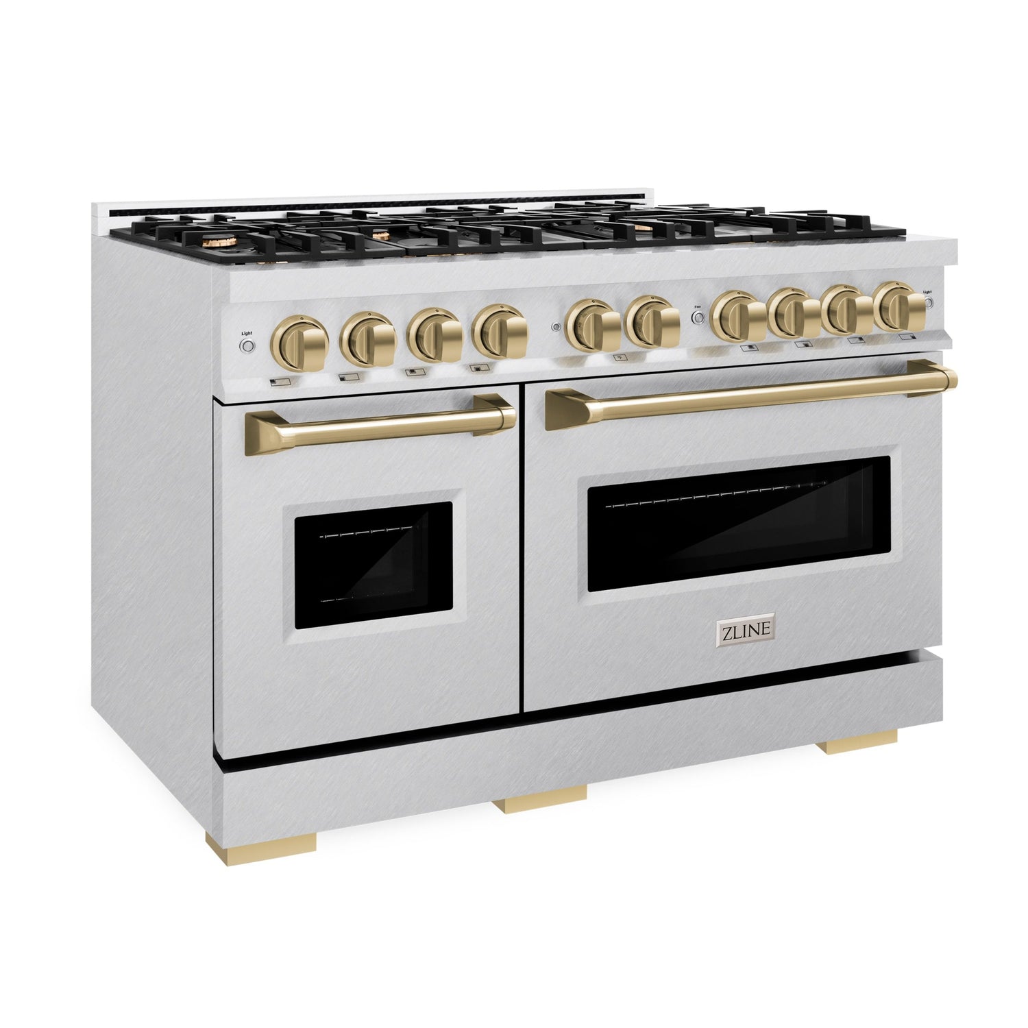ZLINE Autograph 48" 6.7 cu. ft. Classic Double Oven Dual Fuel Range with 8 Burner Gas Cooktop in Satin Stainless Steel and Champagne Bronze Accents, CDRSZ-48-CB