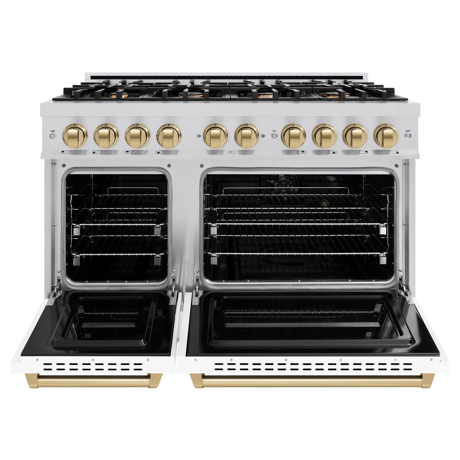 ZLINE Autograph 48" 6.7 cu. ft. Classic Double Oven Dual Fuel Range with 8 Burners in Stainless Steel with White Matte Doors and Champagne Bronze Accents, CDRZ-WM-48-CB