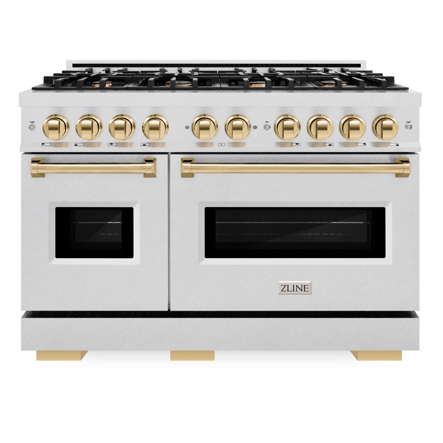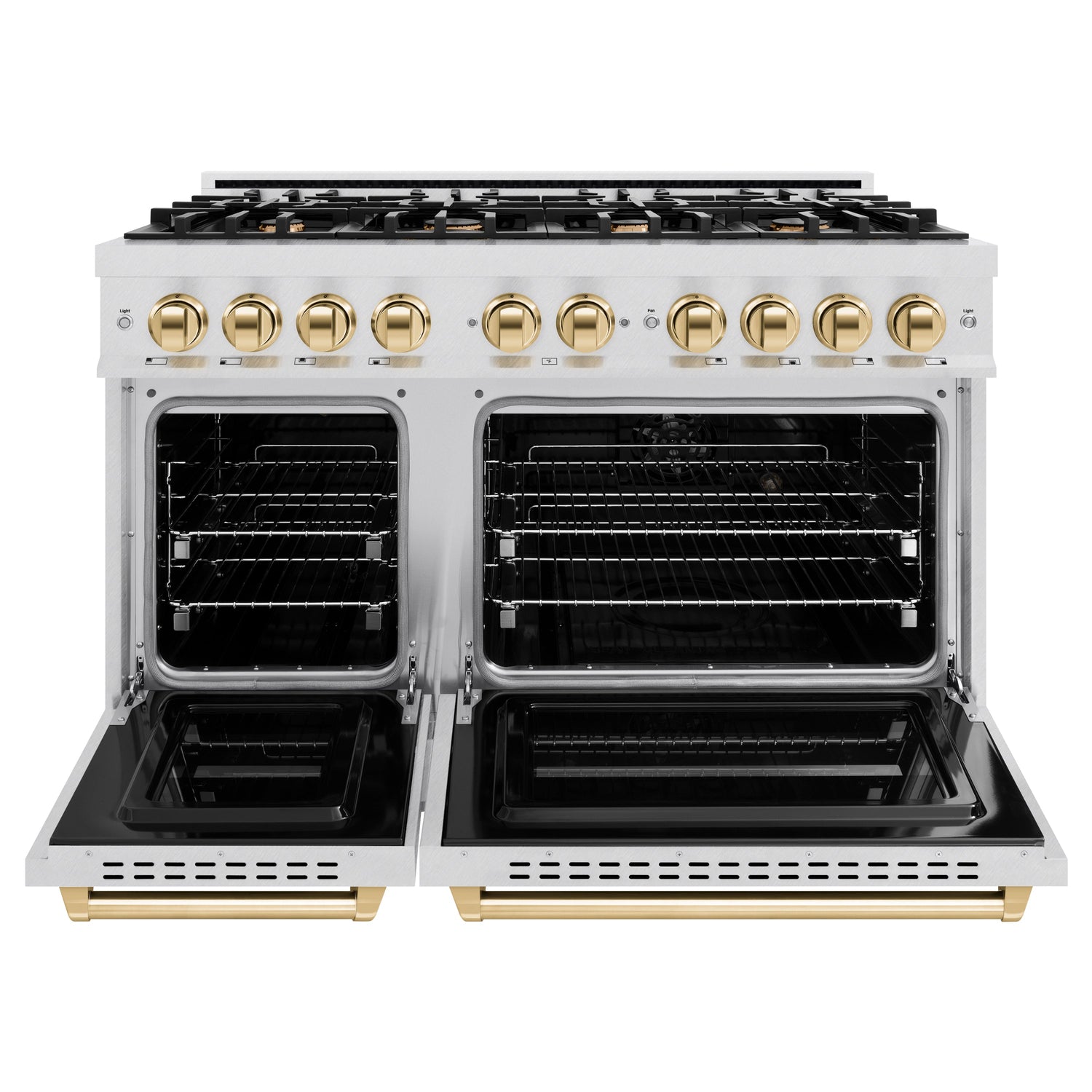 ZLINE Autograph 48" 6.7 cu. ft. Classic Double Oven Gas Range with 8 Burner Cooktop in Satin Stainless Steel and Polished Gold Accents, CGRSZ-48-G
