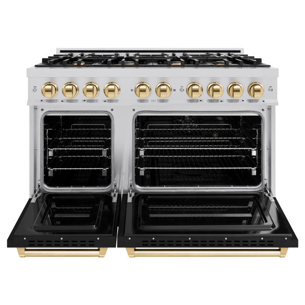 ZLINE Autograph 48" 6.7 cu. ft. Classic Double Oven Gas Range with 8 Burners in Stainless Steel with Black Matte Doors and Polished Gold Accents, CGRZ-BLM-48-G