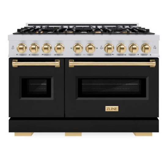 Luxury isn't meant to be desired - it's meant to be attainable. The ZLINE Autograph Edition 48 in. 6.7 cu. ft. Classic Double Oven Gas Range with 8 Burner Cooktop in Stainless Steel with Black Matte Doors and Polished Gold Accents (CGRZ-BLM-48-G) combines the elegance of a hand-finished porcelain gas cooktop with 8 Italian-made auto-reignition burners, a large gas convection oven with an energy-efficient cooling fan to ensure quiet operation, a small baking oven, beautiful black matte doors with Landscape window designs, and stunning polished gold knobs and handles allowing you to master every meal. With a modern, timeless style and refined functionality, ZLINE Classic Gas Ranges are masterfully crafted to deliver an elevated culinary experience.
