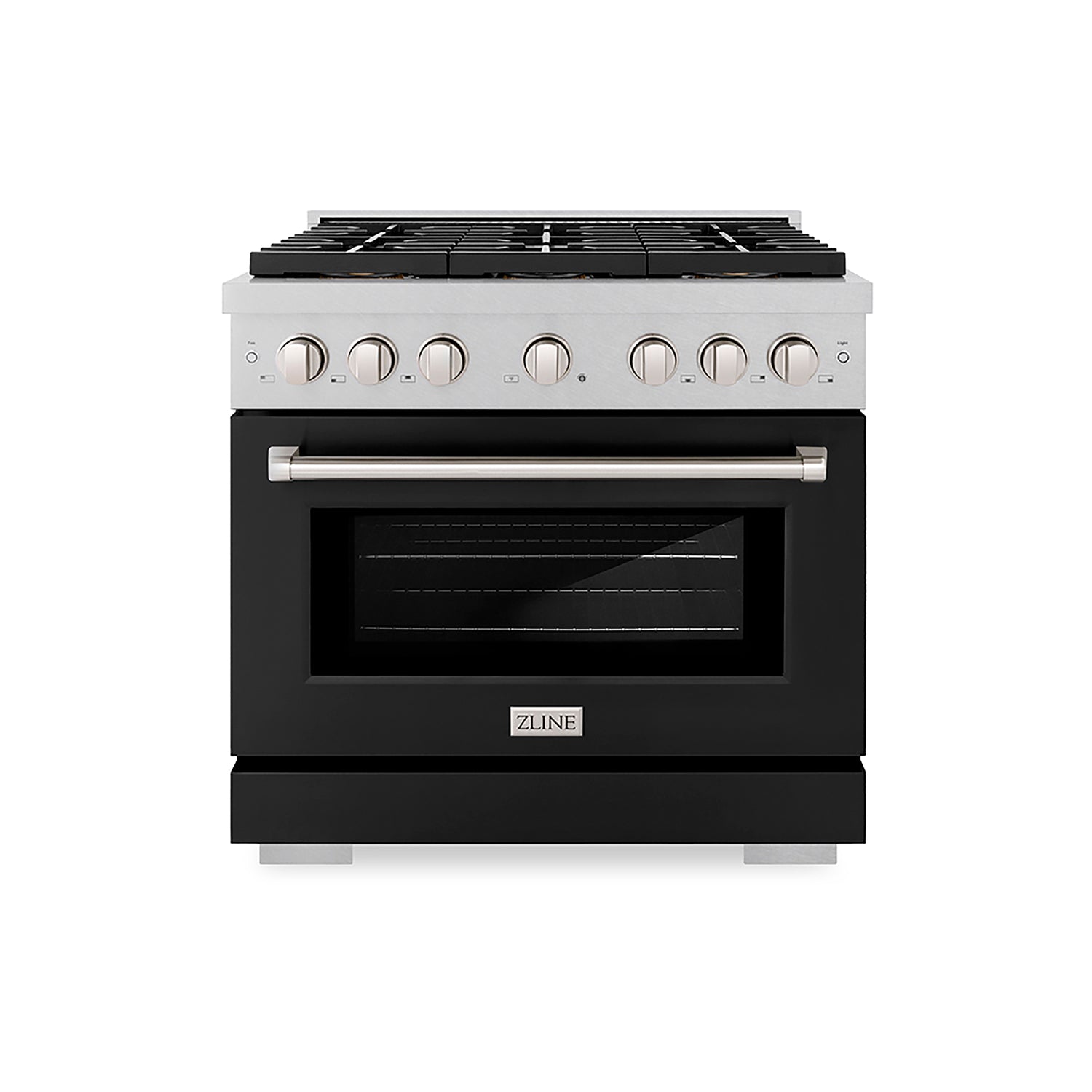 ZLINE 36" 5.2 cu. ft. Paramount Dual Fuel Range with 6 Burner DuoPro™ Cooktop and Electric Convection Oven in Satin Stainless Steel with Black Matte Door, PSDRS-BLM-36