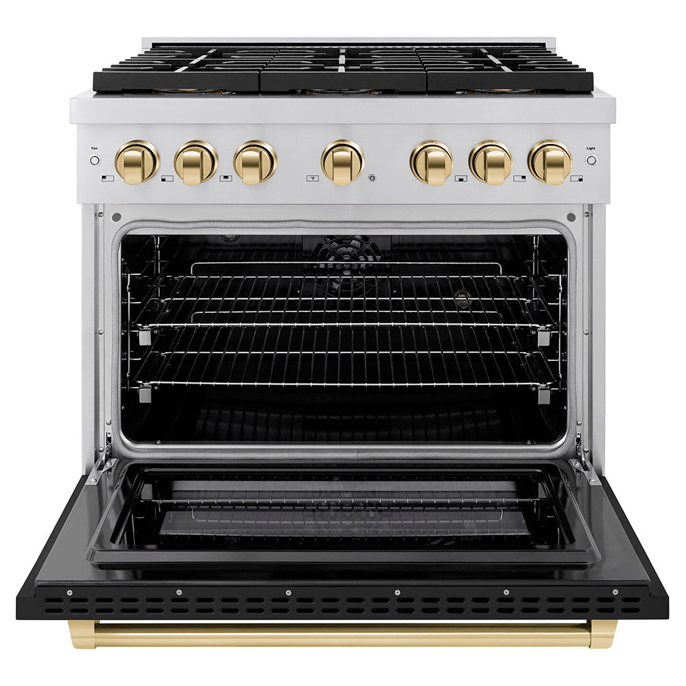 ZLINE Autograph 36" 5.2 cu. ft. Paramount Dual Fuel Range with 6 Burner DuoPro™ Cooktop and Electric Convection Oven with Black Matte Door and Polished Gold Accents, PSDRZ-BLM-36-G
