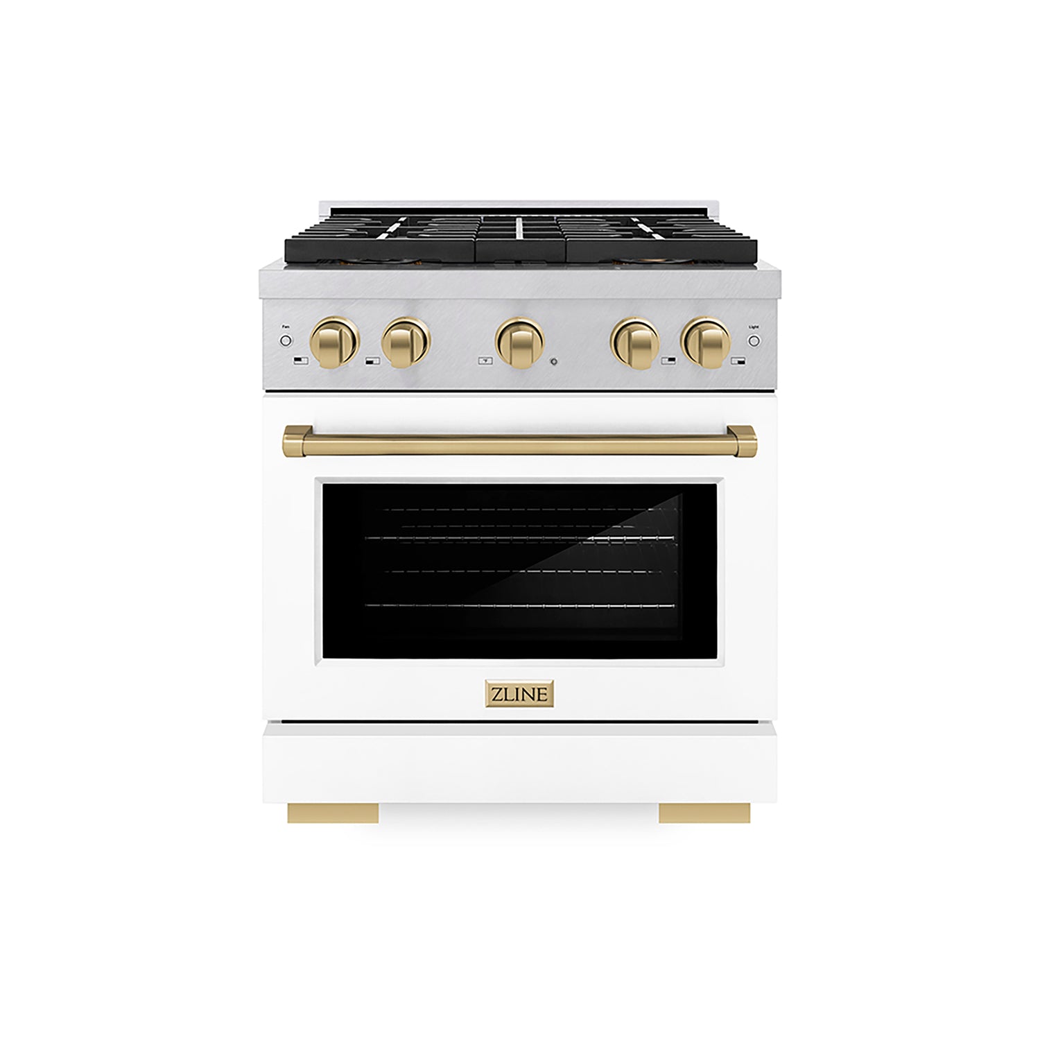 ZLINE Autograph Edition 30" 4.2 cu. ft. Paramount Gas Range with 4 Burner DuoPro™ Cooktop and Convection Gas Oven in Satin Stainless Steel with White Matte Door and Champagne Bronze Accents, PSGRSZ-WM-30-CB
