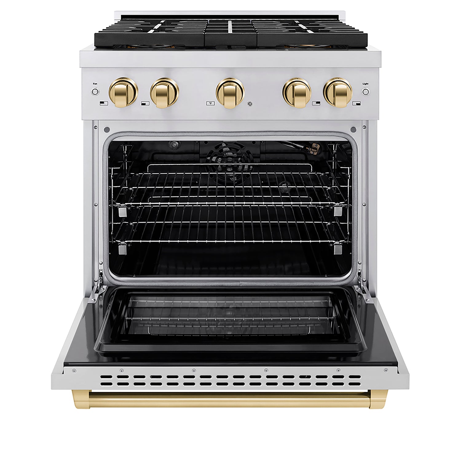 Luxury isn’t meant to be desired—it’s meant to be attainable. The ZLINE Autograph Edition 30 in. 4.2 cu. ft. Paramount Gas Range with 4 Burner DuoPro™ Cooktop and Convection Gas Oven in Stainless Steel with Polished Gold Accents (PSGRZ-30-G) features a high-powered gas cooktop with 4 hand-crafted Italian dual-ring brass burners and a versatile gas convection oven allowing you to master every meal. Double your cooking power on every burner with a DuoPro™ Cooktop that delivers ultimate flame control flexibility and unprecedented culinary confidence.
