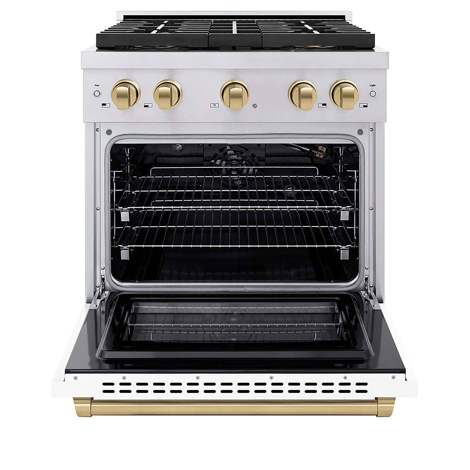 Luxury isn’t meant to be desired—it’s meant to be attainable. The ZLINE Autograph Edition 30 in. 4.2 cu. ft. Paramount Gas Range with 4 Burner DuoPro™ Cooktop and Convection Gas Oven in Stainless Steel with White Matte Door and Champagne Bronze Accents (PSGRZ-WM-30-CB) features a high-powered gas cooktop with 4 hand-crafted Italian dual-ring brass burners and a versatile gas convection oven allowing you to master every meal. Double your cooking power on every burner with a DuoPro™ Cooktop that delivers ultimate flame control flexibility and unprecedented culinary confidence.