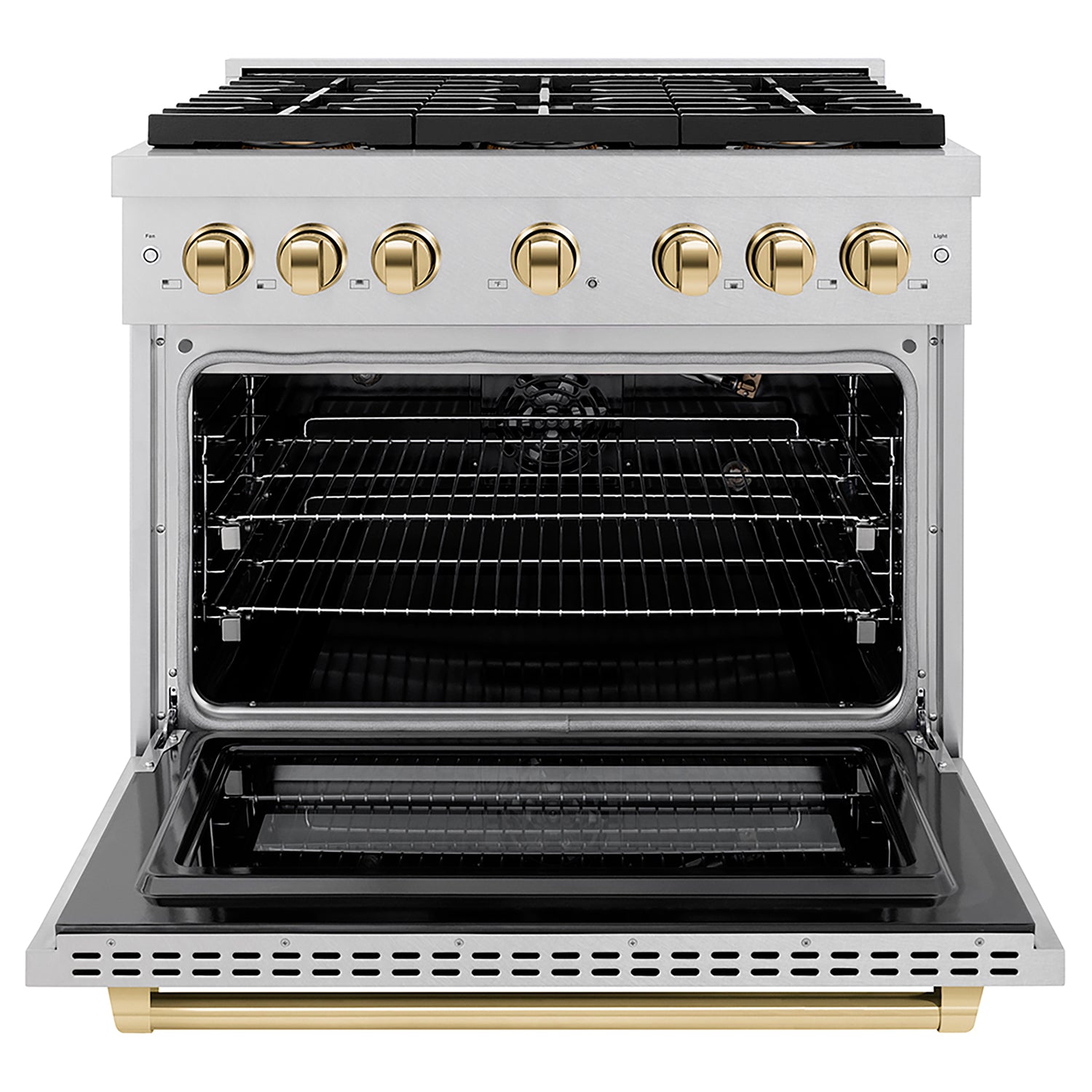 ZLINE Autograph Edition 36" 5.2 cu. ft. Paramount Gas Range with 6 Burner DuoPro™ Cooktop and Convection Gas Oven in Satin Stainless Steel and Polished Gold Accents, PSGRSZ-36-G