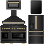 ZLINE Autograph Appliance Package - 48" Gas Range, Range Hood, 36" Refrigerator with Water/Ice Dispenser, 24" Microwave Drawer and Dishwasher in Black Stainless Steel with Champagne Bronze Accents