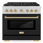 ZLINE Autograph 36" 5.2 cu. ft. Paramount Dual Fuel Range with 6 Burner Gas Cooktop and Electric Convection Oven in Satin Stainless Steel with Black Matte Door and Polished Gold Accents, SDRSZ-BLM-36-G