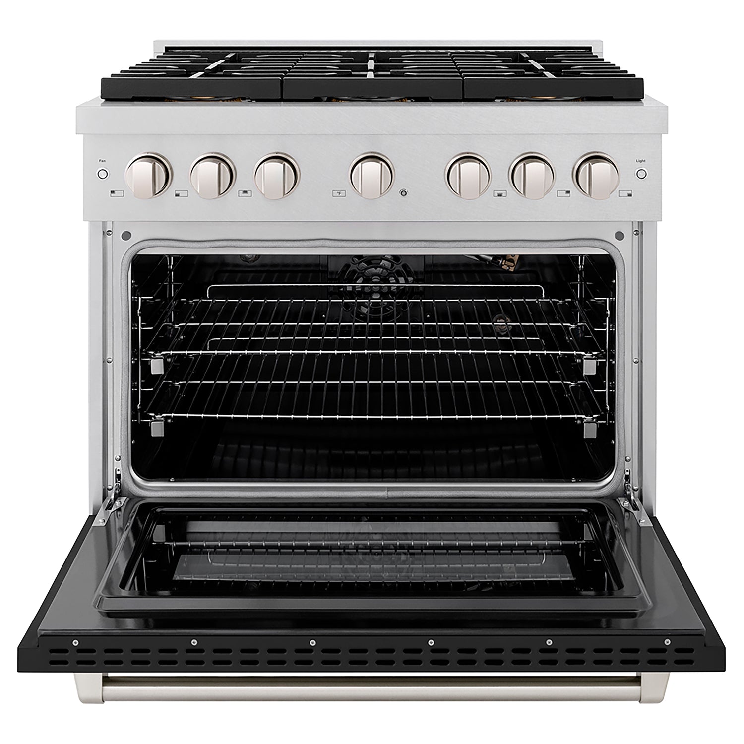 ZLINE 36" 5.2 cu. ft. Paramount Gas Range with 6 Burner DuoPro™ Cooktop and Convection Gas Oven in Satin Stainless Steel with Black Matte Door, PSGRS-BLM-36