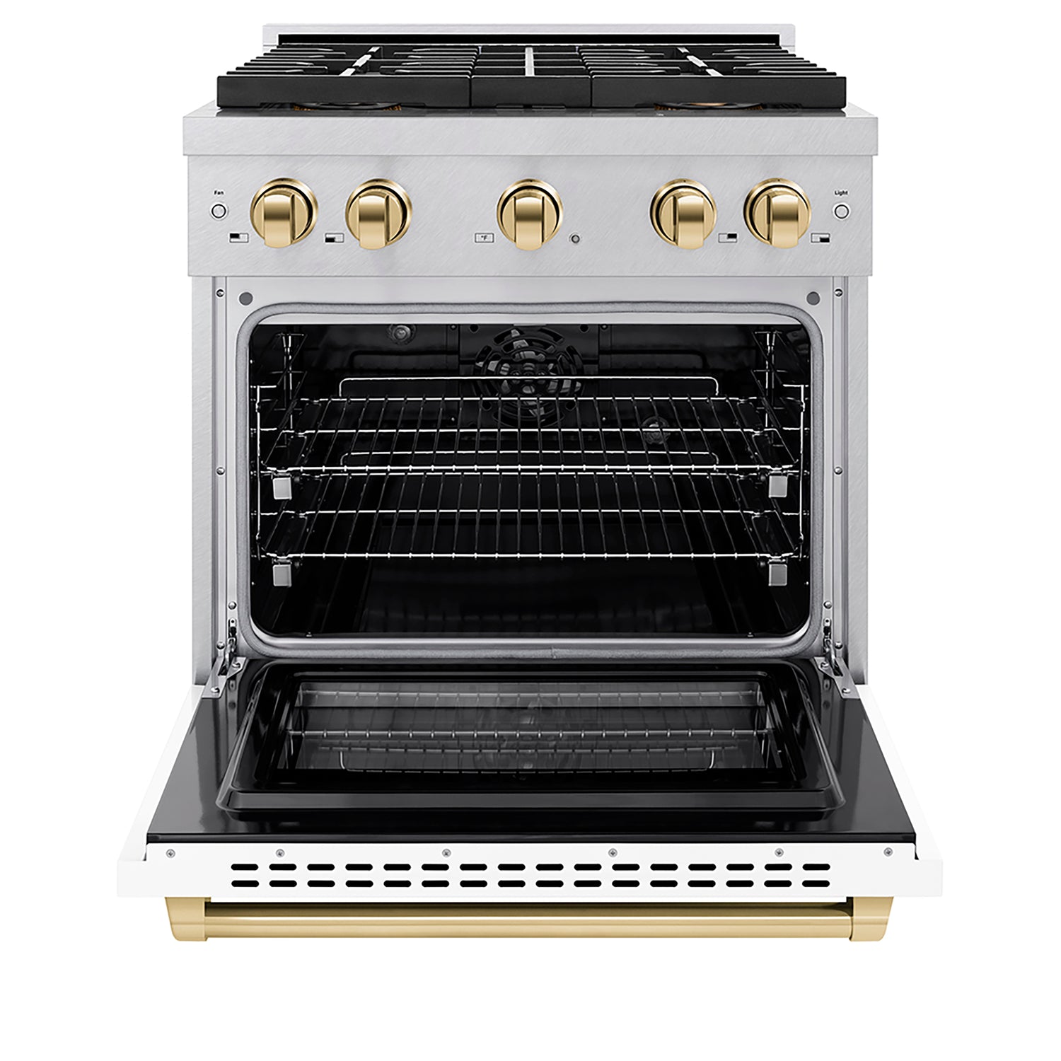 Luxury isn’t meant to be desired—it’s meant to be attainable. The ZLINE Autograph Edition 30 in. 4.2 cu. ft. Paramount Dual Fuel Range with 4 Burner DuoPro™ Cooktop and Electric Convection Oven in Satin Stainless Steel with White Matte Door and Polished Gold Accents (PSDRSZ-WM-30-G) features a high-powered gas cooktop with 4 hand-crafted Italian dual-ring brass burners and a versatile electric convection oven allowing you to master every meal. Double your cooking power on every burner with a DuoPro™ Cooktop that delivers ultimate flame control flexibility and unprecedented culinary confidence.